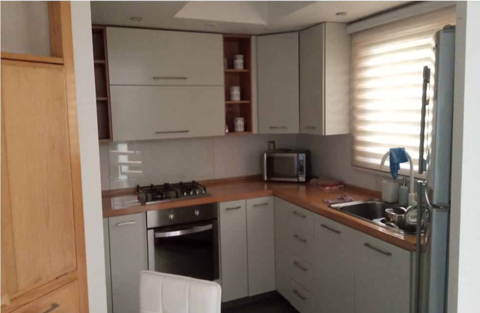 Cocina integral remodelada, equipada con barra desayunadora que conecta con el área social.