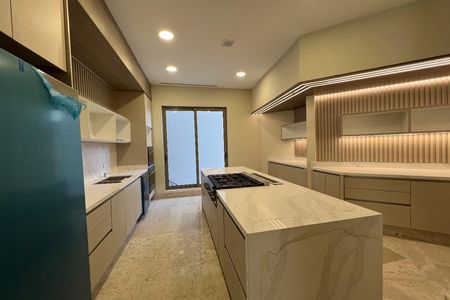 • Electrodomésticos línea Premium importados: refrigerador/congelador 36” con regulador de voltaje, parrilla de gas 36”, campana tipo isla de 170 cm, horno eléctrico 30”, micro-oven 27”, lavavajillas empotrada de 16 ciclos, triturador de basura, filtro de osmosis inversa y tarja doble con llave monomando extraíble.