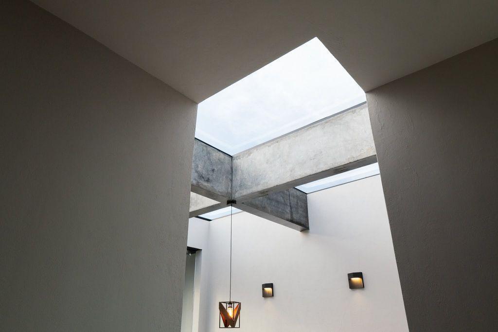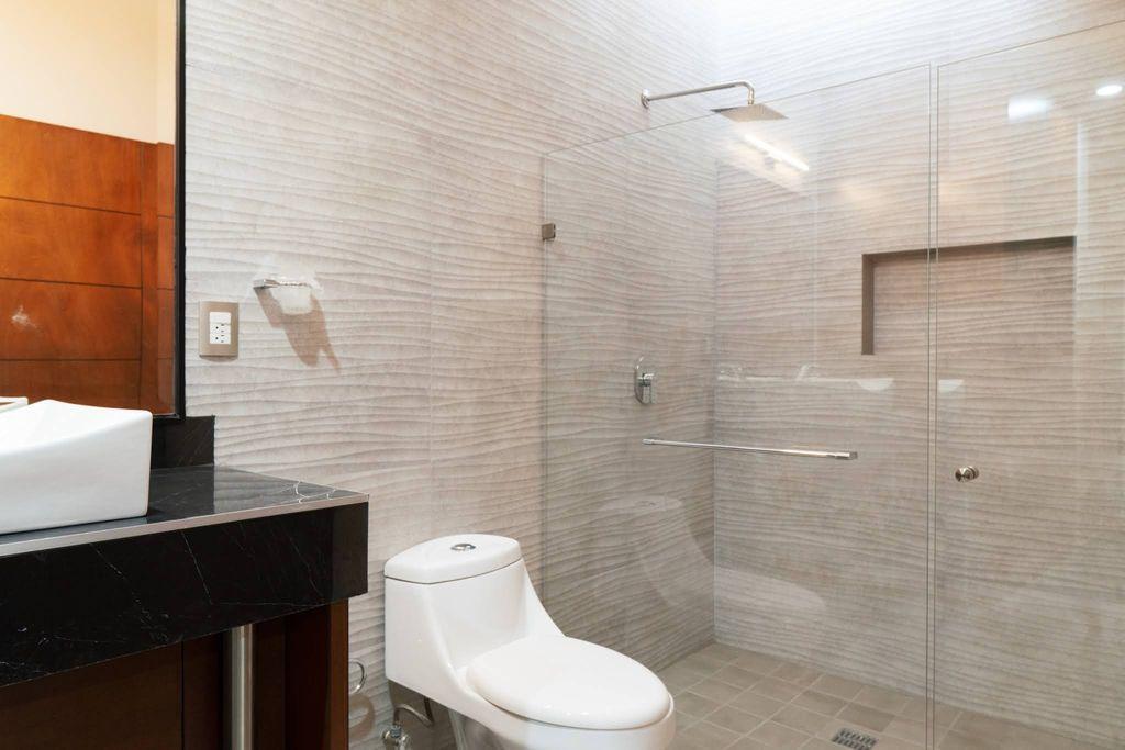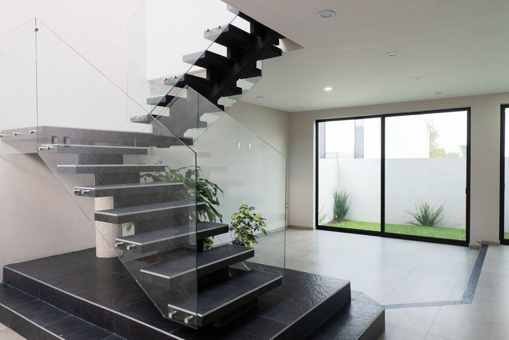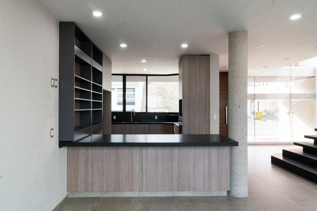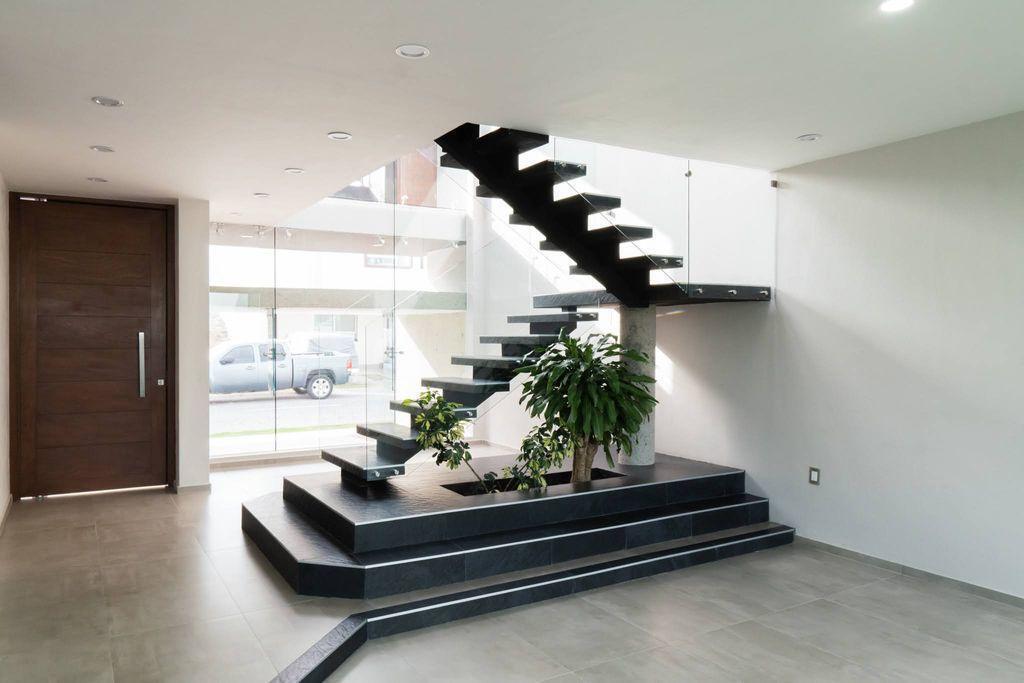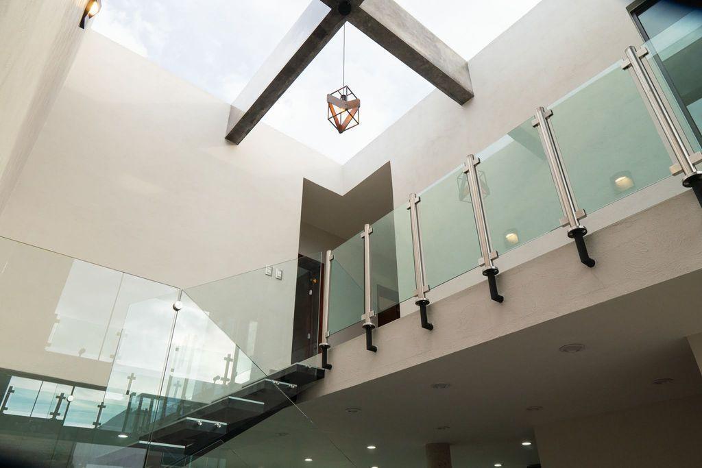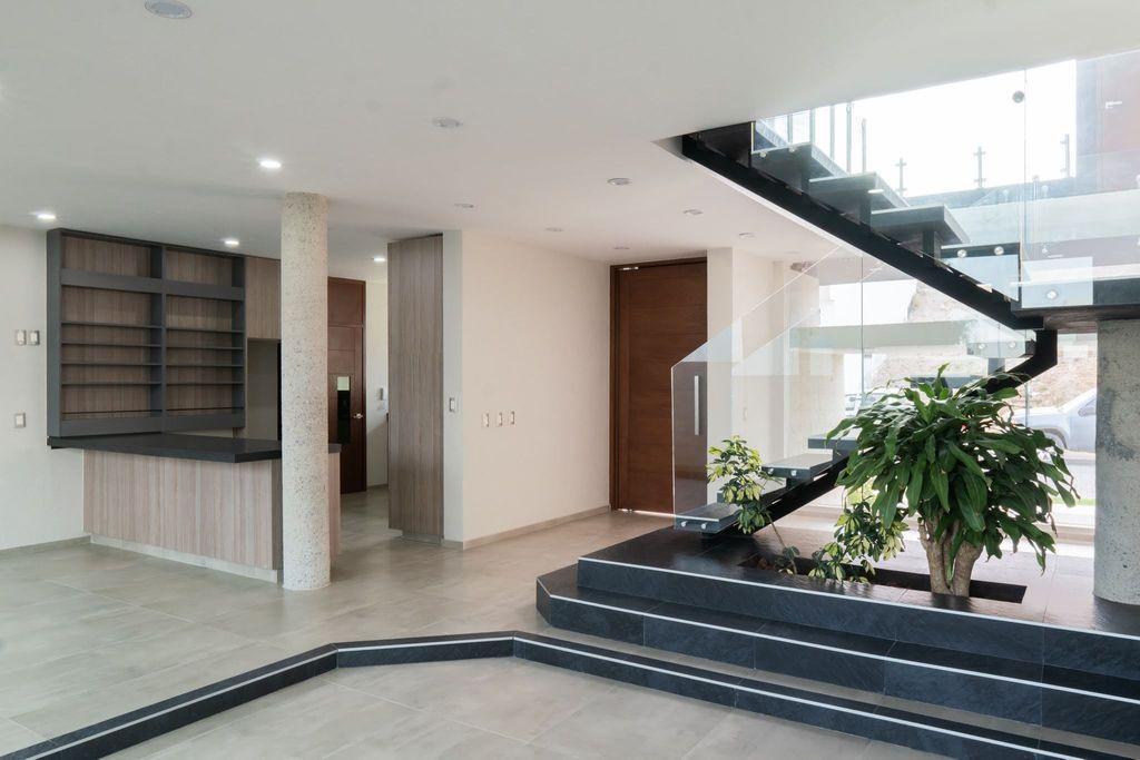 - Planta Baja; área vestíbulo estudio abierto doble altura, escalera con pasamanos y ventanales templados, domo de cristal templado con filtro UV, Cocina integral con barra desayunadora con granito flameado, estufa parrilla y hornos separados, sala comedor muy amplios, medio baño, jardín, servicio con ingreso independiente y a la cocina.