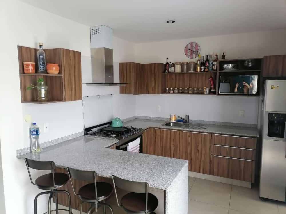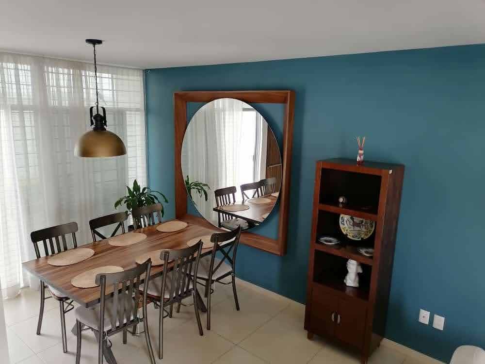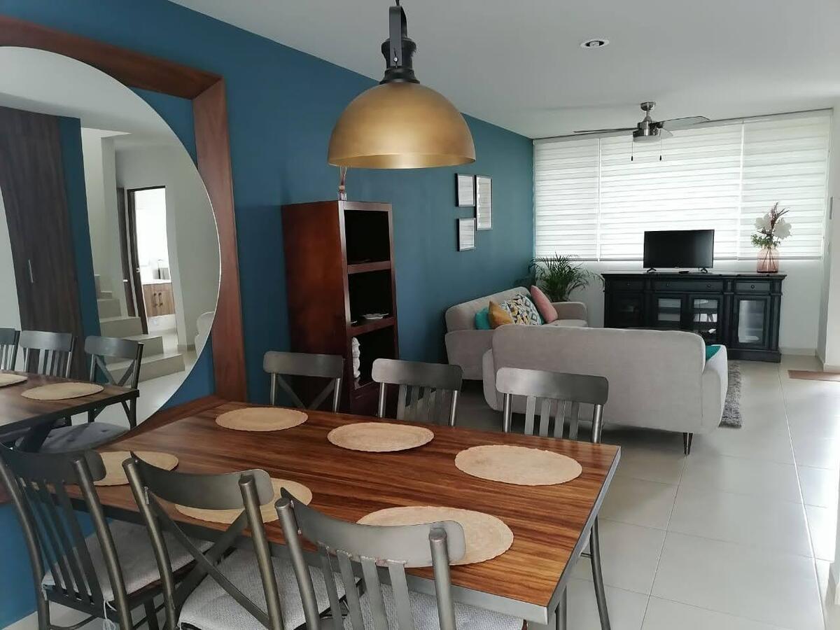 La casa cuenta con 3 recamaras, cama matrimonial y 3 individuales, 2.5 baños, closets, sala, comedor, lavadora, secadora, refrigerador, horno de microondas, pantalla de 32”, área de lavado techada, cocina integral equipada con estufa y campana, tanque estacionario, boiler automático, cochera dos autos.