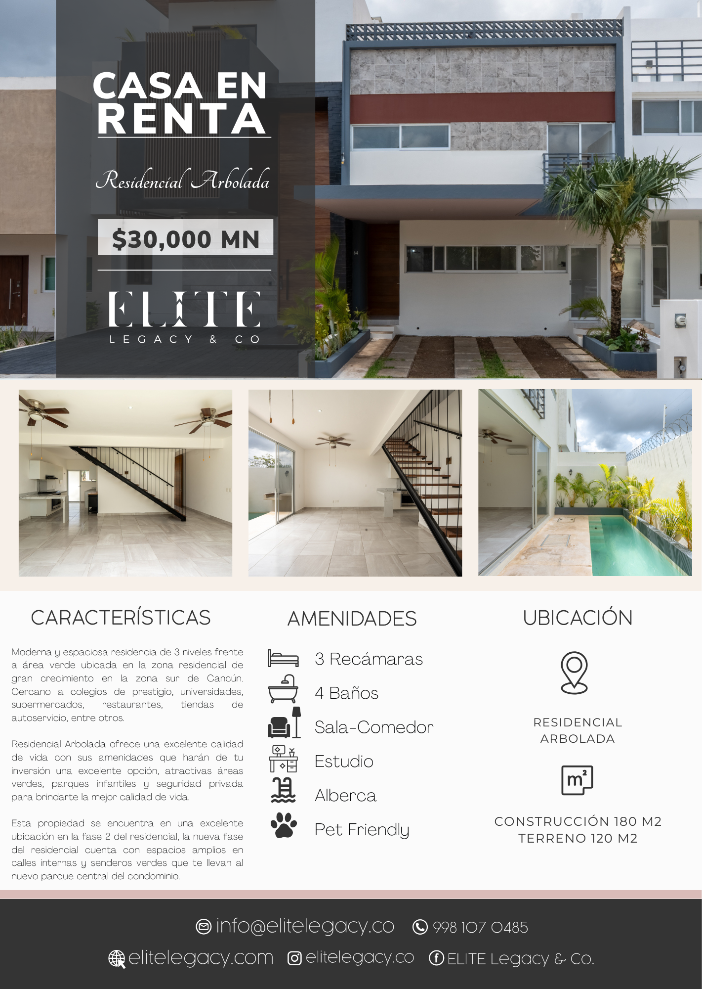 Moderna y espaciosa residencia de 3 niveles frente a área verde ubicada en la zona residencial de gran crecimiento en la zona sur de Cancún. Cercano a colegios de prestigio, universidades, supermercados, restaurantes, tiendas de autoservicio, entre otros.