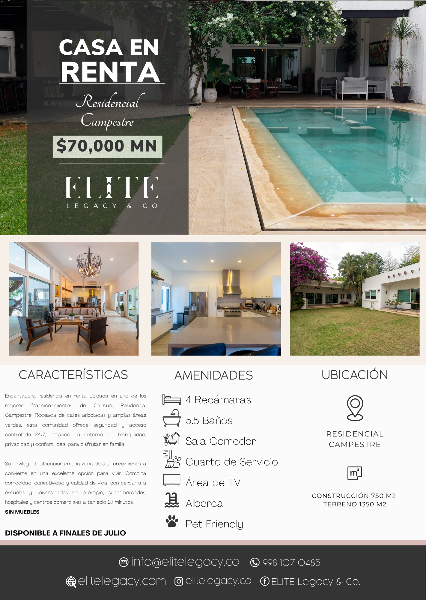 Encantadora residencia en renta ubicada en uno de los mejores fraccionamientos de Cancún, Residencial Campestre. Rodeada de calles arboladas y amplias áreas verdes, esta comunidad ofrece seguridad y acceso controlado 24/7, creando un entorno de tranquilidad, privacidad y confort, ideal para disfrutar en familia. SIN MUEBLES