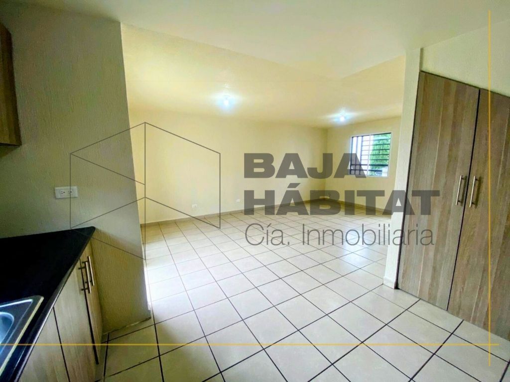 Espacio abierto que integra sala, comedor y cocina, con un medio baño para visitas.