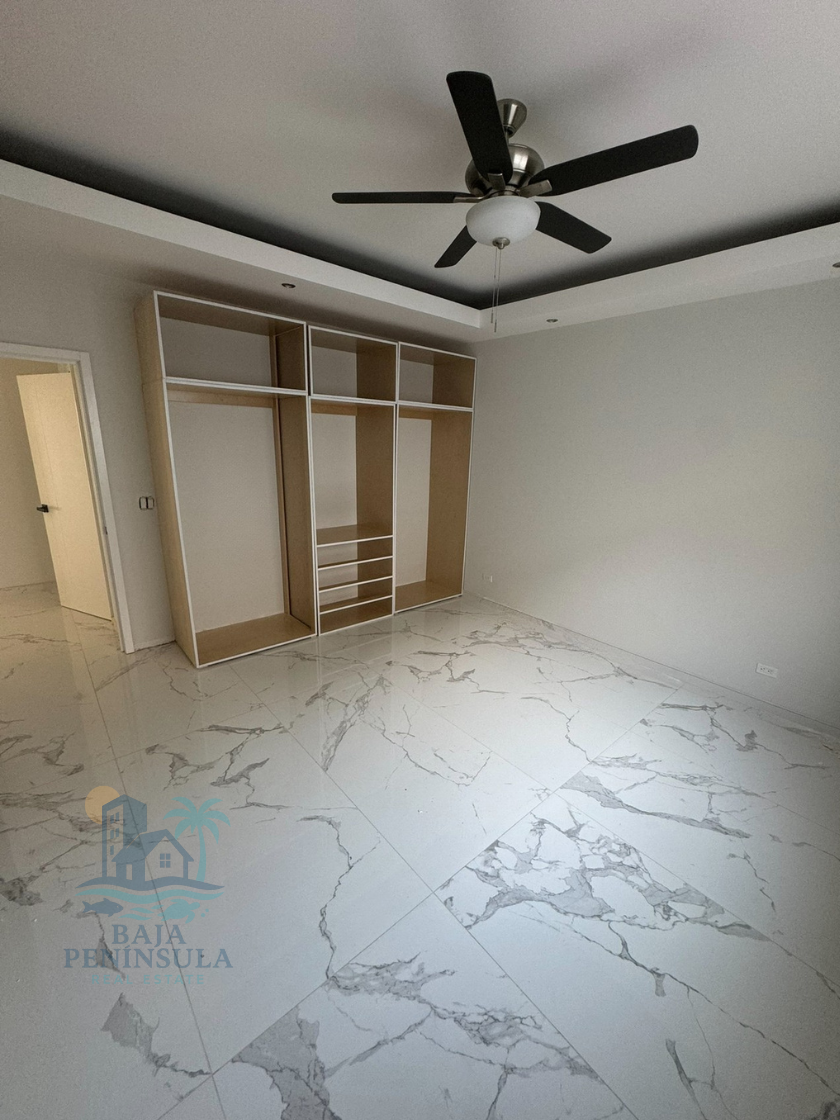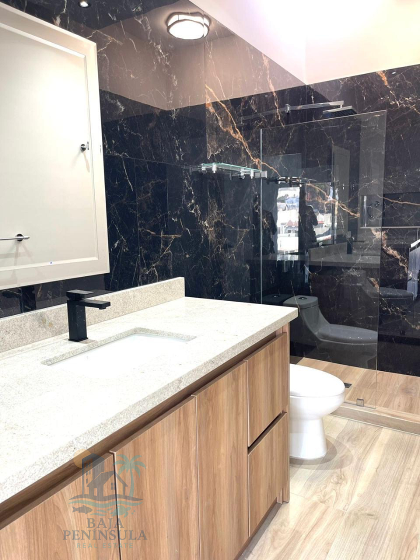 • 2 baños completos y 1 medio baño, con acabados de lujo en mármol y canceles de vidrio templado