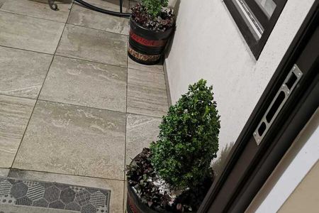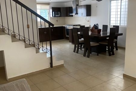 Primera planta : cochera para 2 autos 🚘, lavandería, 1/2 baño, cocina equipada con campana, parrilla, microondas, horno, sala, comedor y patio.