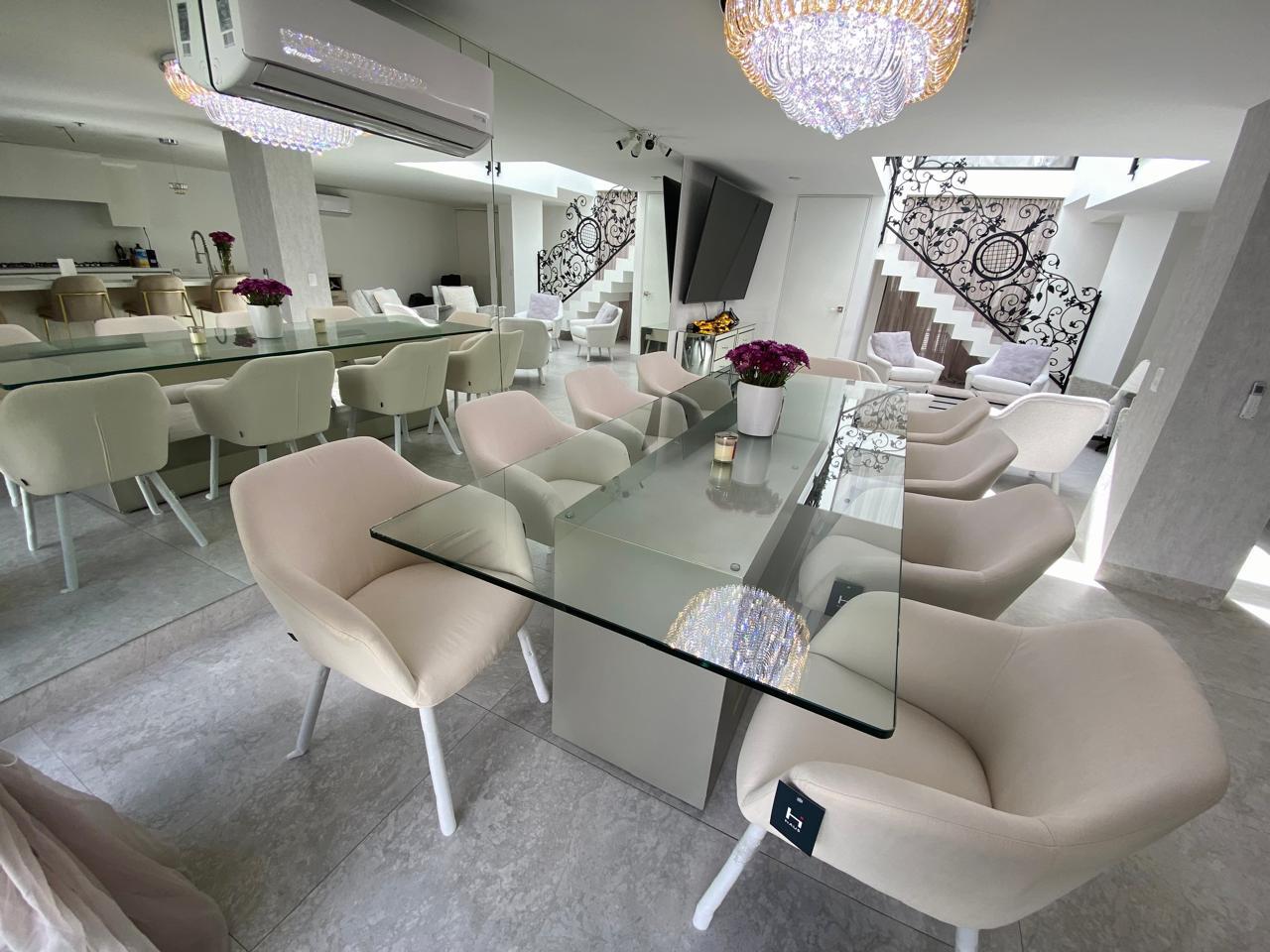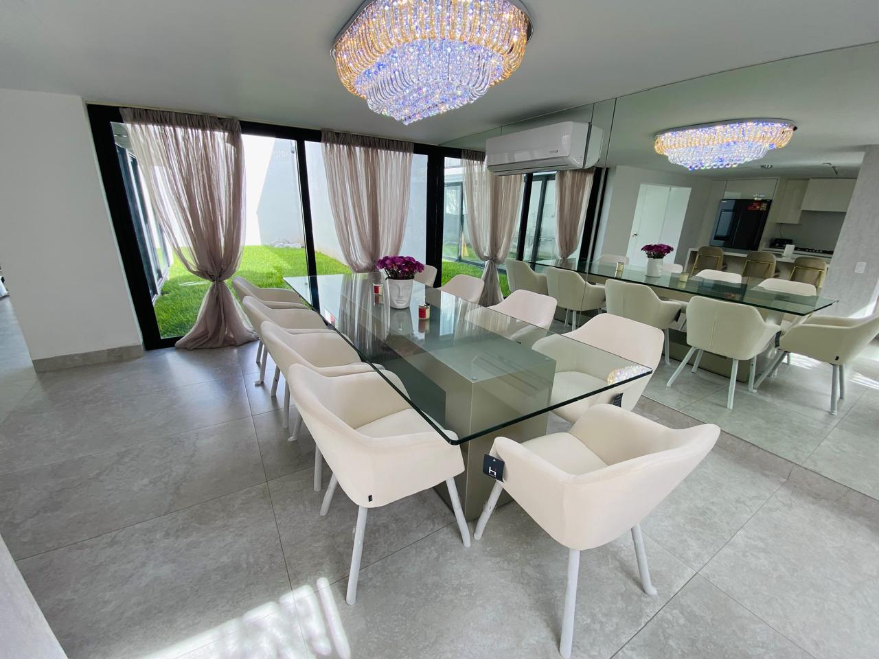 2 estufas nuevas que en total suman 12 quemadores, cuenta con plancha para Teppanyaki en la isla. y candiles modernos increíbles. Baño completo para visitas en planta baja, Cuenta con un jardín amplio con sistema de riego coordinable con Alexa o con celular, es una casa inteligente que permite coordinar los climas y el portón a través del celular. Cuenta con dos tinacos nuevos 1850 litros en total cada tinaco con su hidroneumático y sus filtros de carbono especiales para purificar el agua. La cochera es para dos autos con portón eléctrico sincronizado al cel. y por fuera se puede estacionar un tercer auto. También cuenta con circuito cerrado de seguridad, y con climas Inverter nuevos sincronizados con Alexa al celular. NO CUENTA CON CUARTO DE SERVICIO. Solo tiene 3 recamaras en planta alta. Se admite mascota solo razas pequeñas.