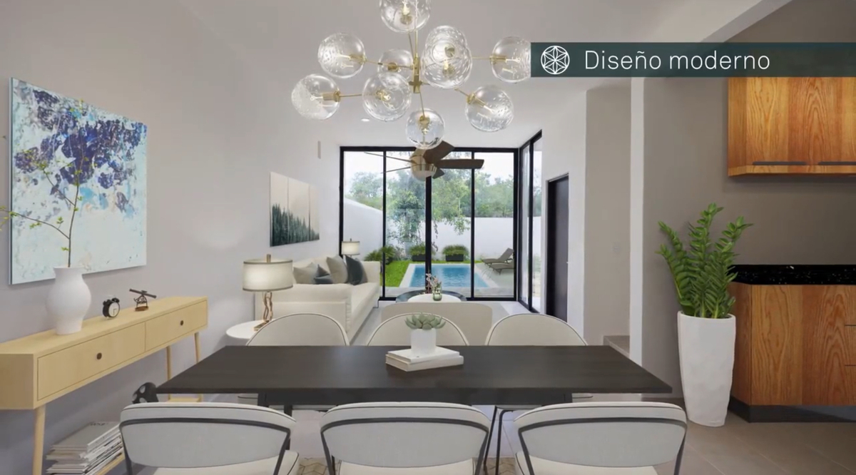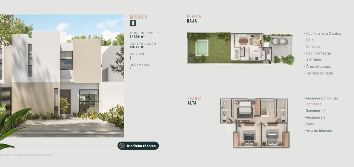 • Planta baja: sala, comedor, cocina integral, medio baño, terraza techada y área de lavado.