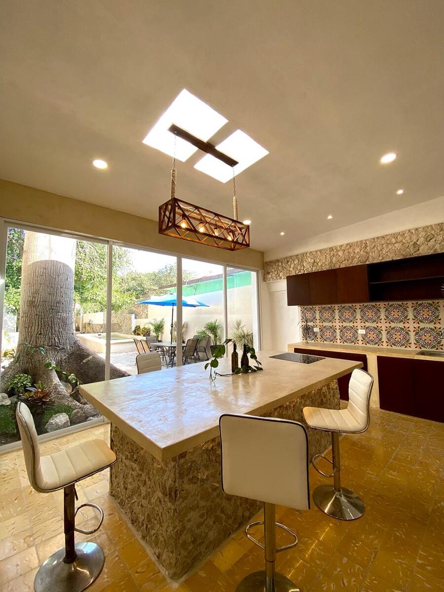 Cocina y comedor juntos con vista a la piscina, isla amplia con estufa eléctrica, gavetas de madera, acabado con Chukum, piso de pasta y aire acondicionado.