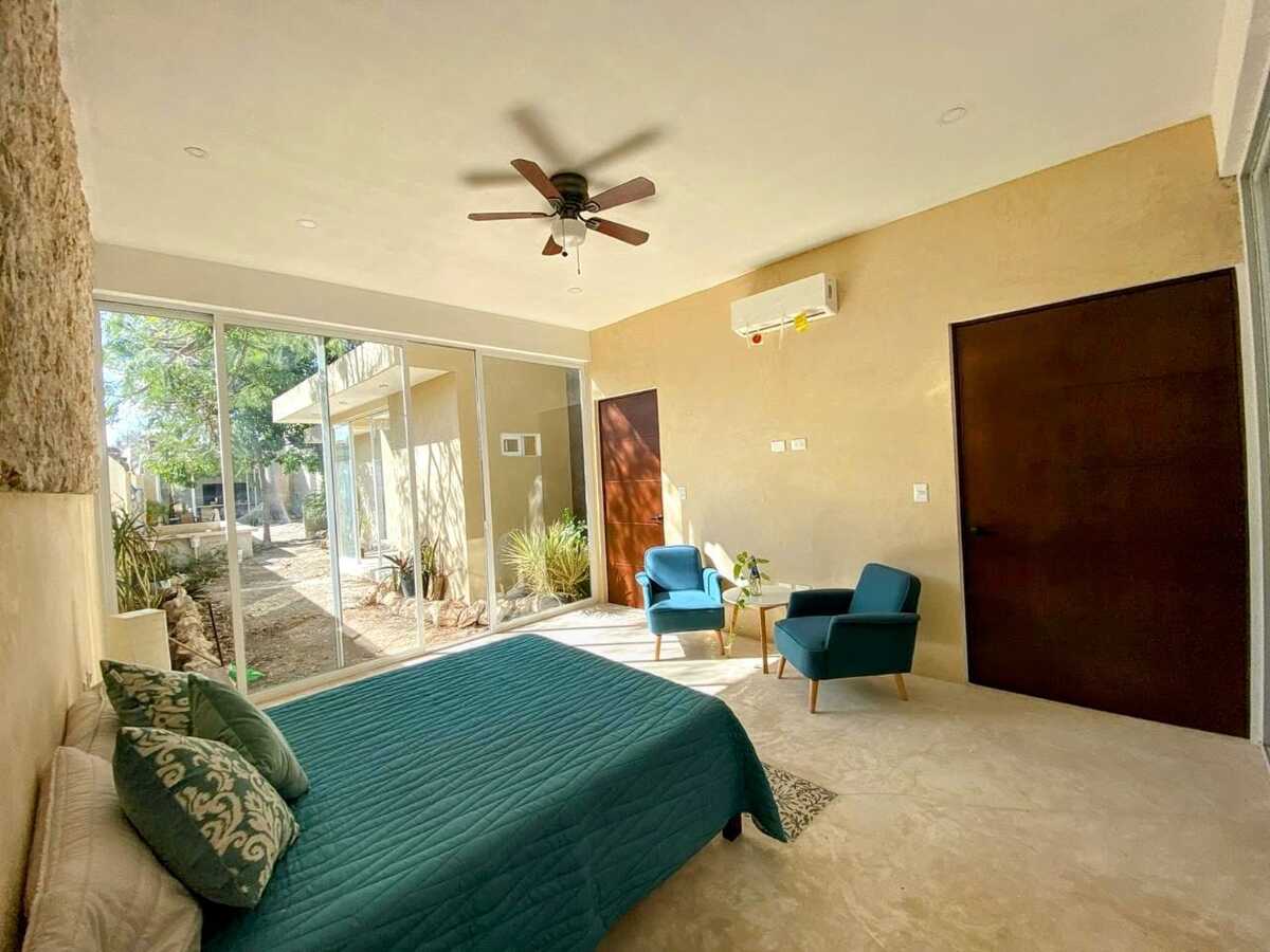 Habitación principal con baño completo, closet vestidor, dos jardines interiores, vista a la terraza, aire acondicionado y ventilador.