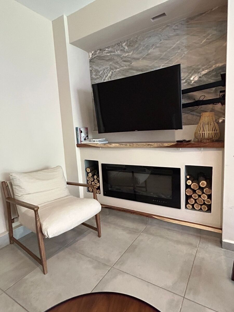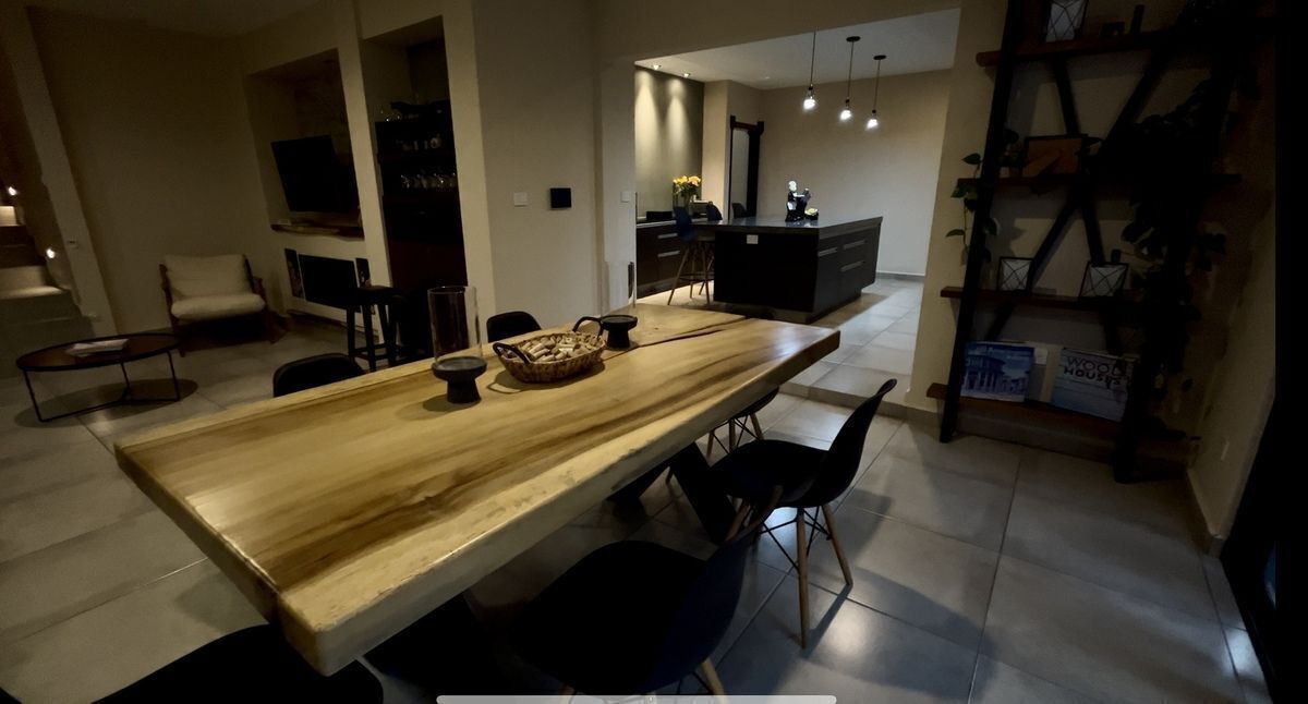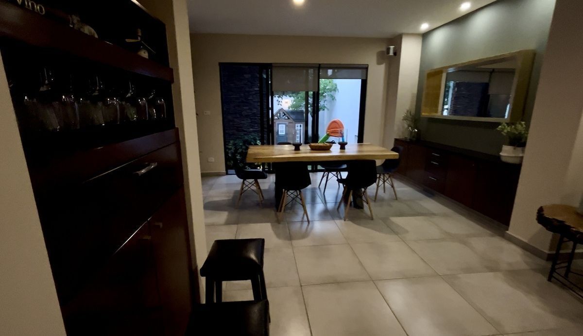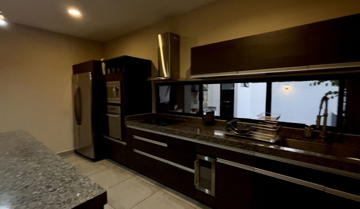 Área de sala, comedor, cocina con isla de granito, alacena, muebles empotrados (bar, libreros, chimenea) área de lavado y espacio de servicio.
