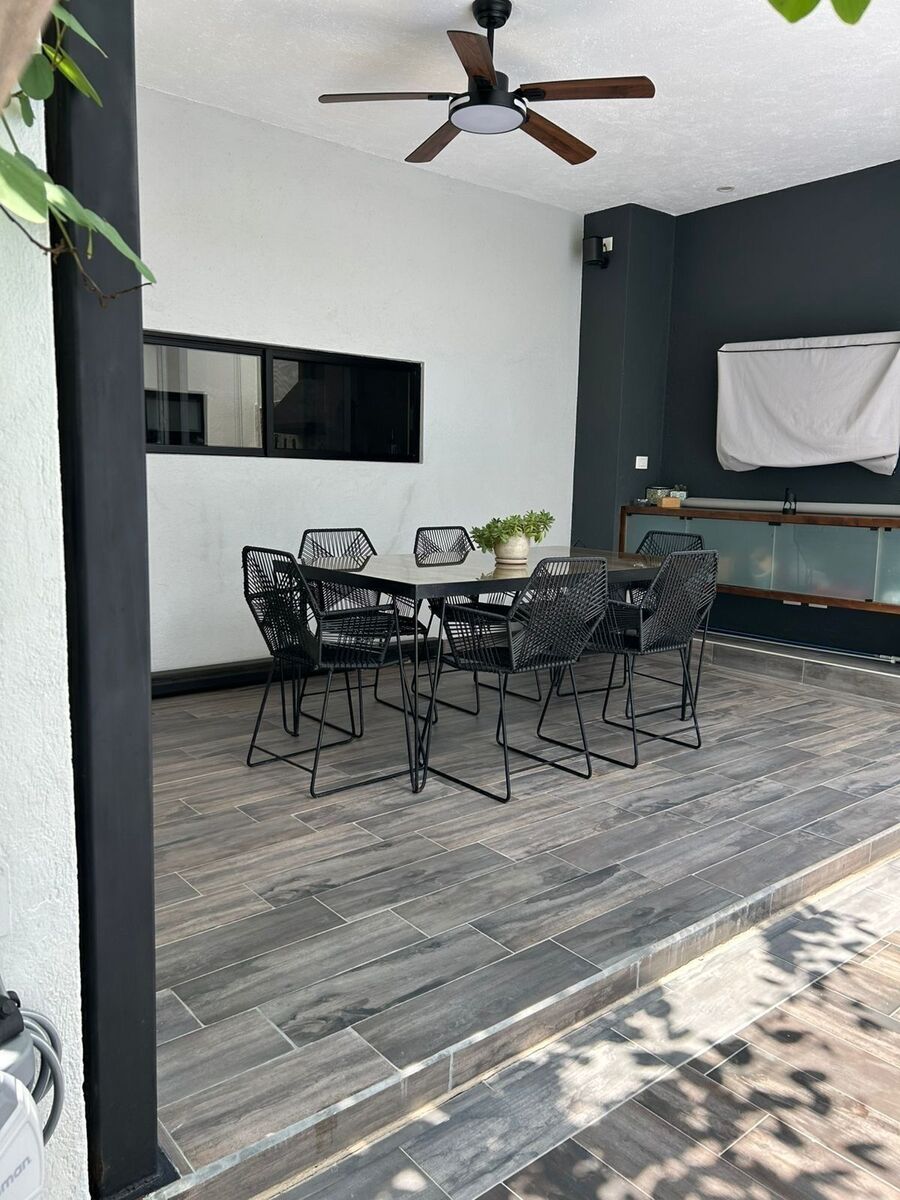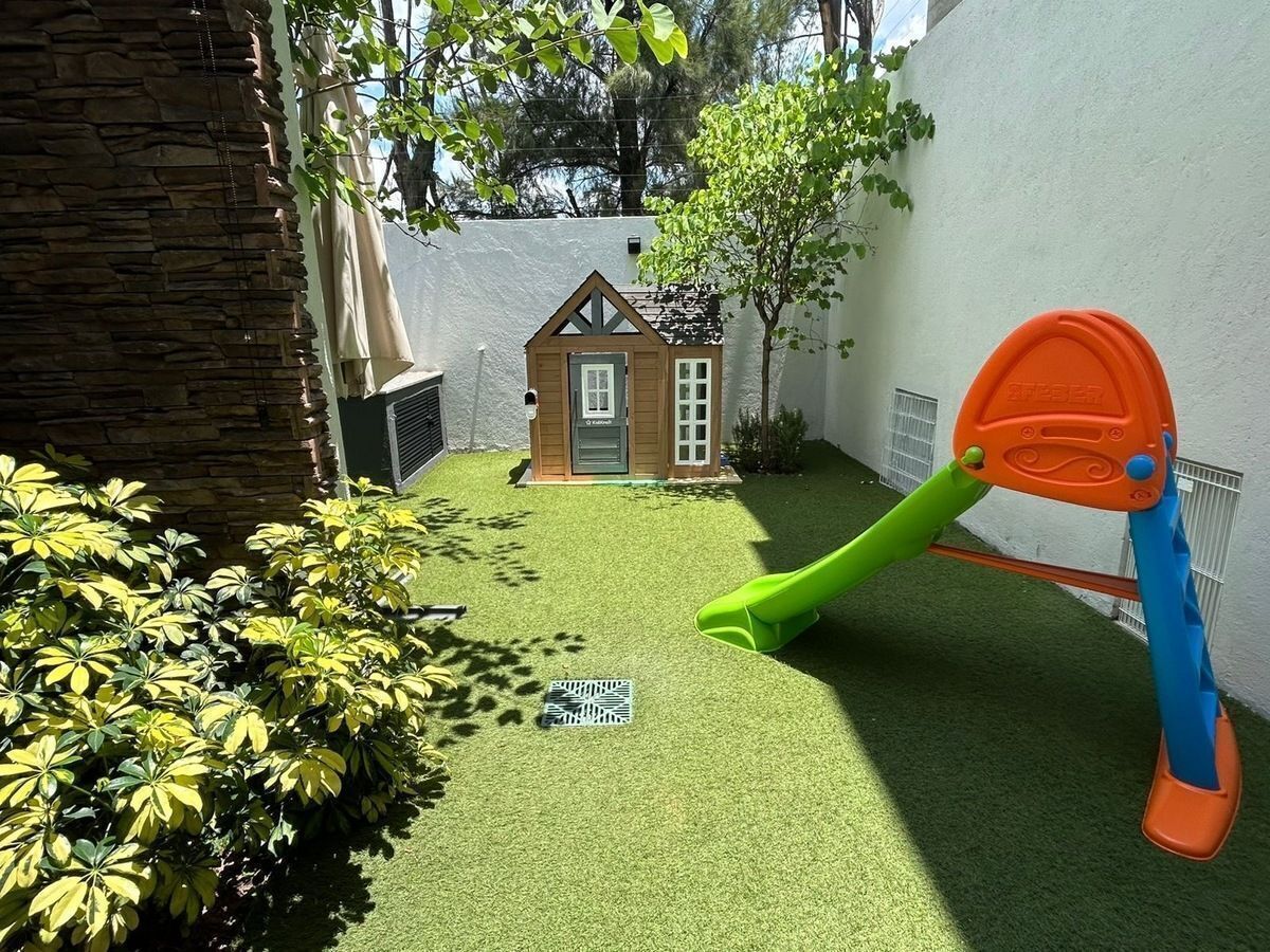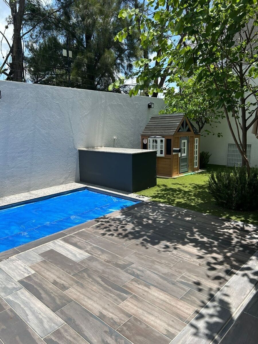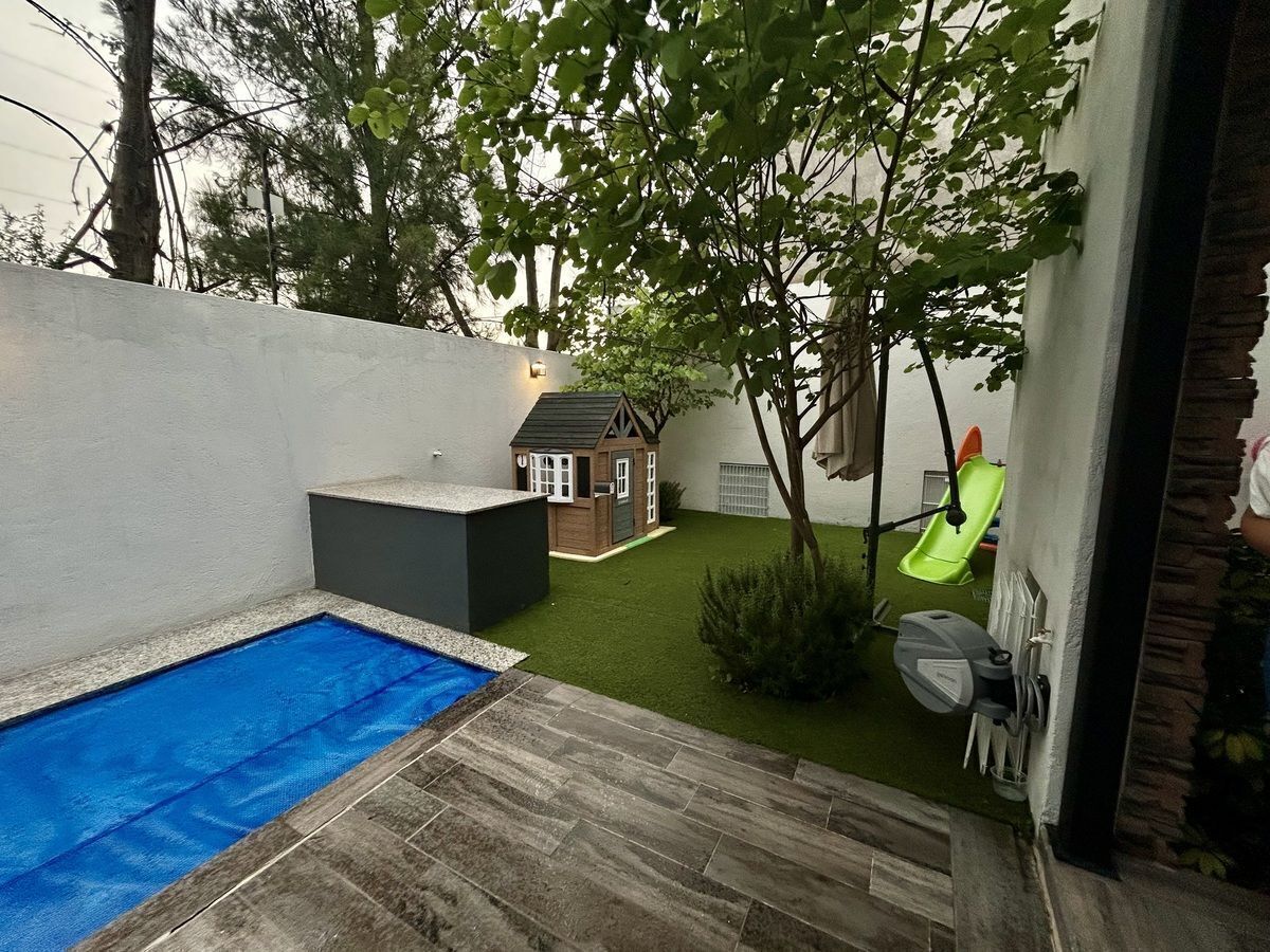 Terraza, jardín con pasto sintético, alberca con calefacción, asador y baño completo