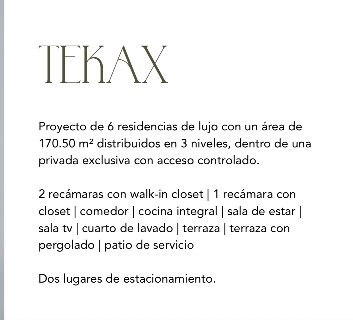 Conjunto residencial exclusivo compuesto por 6 residencias de lujo, cada una con un área de 170.50 m², distribuidos en 3 niveles. Acceso controlado y privacidad garantizada.