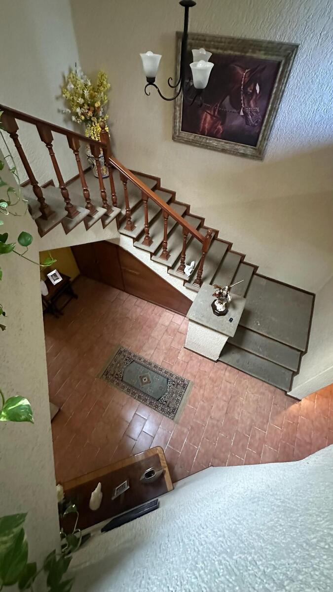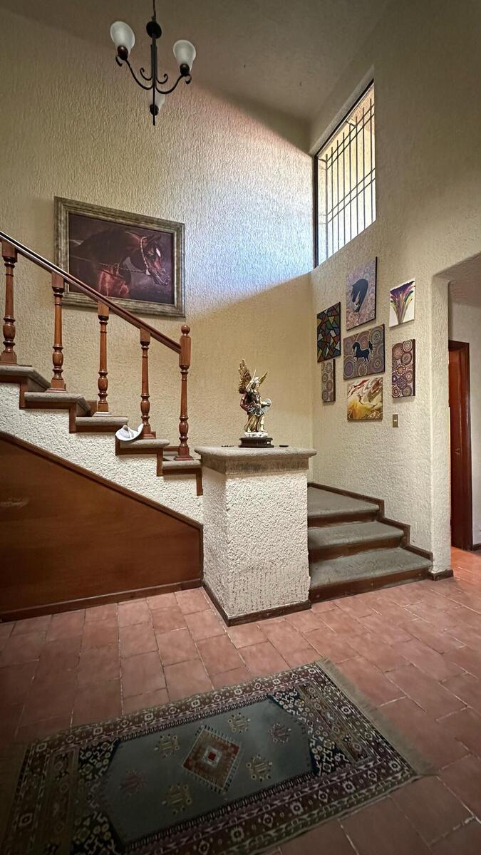 Al ingresar a la propiedad, te recibe un portón eléctrico que da acceso a una cochera con capacidad para 6 vehículos. El jardín y las áreas verdes que rodean la entrada brindan una sensación de frescura y elegancia. El recibidor de doble altura conecta perfectamente los espacios de la planta baja y alta, destacando la impresionante escalera con huellas de cantera y un hermoso pasamanos de madera sólida.