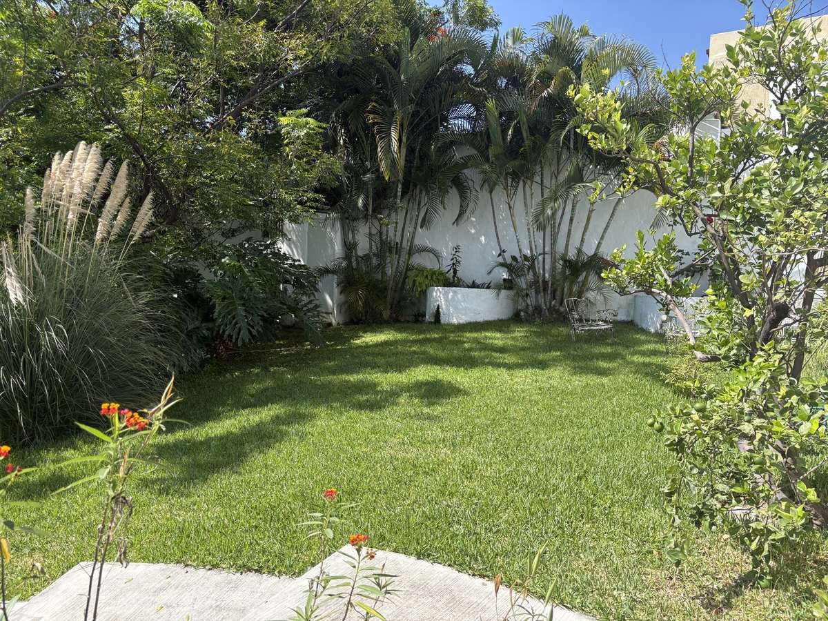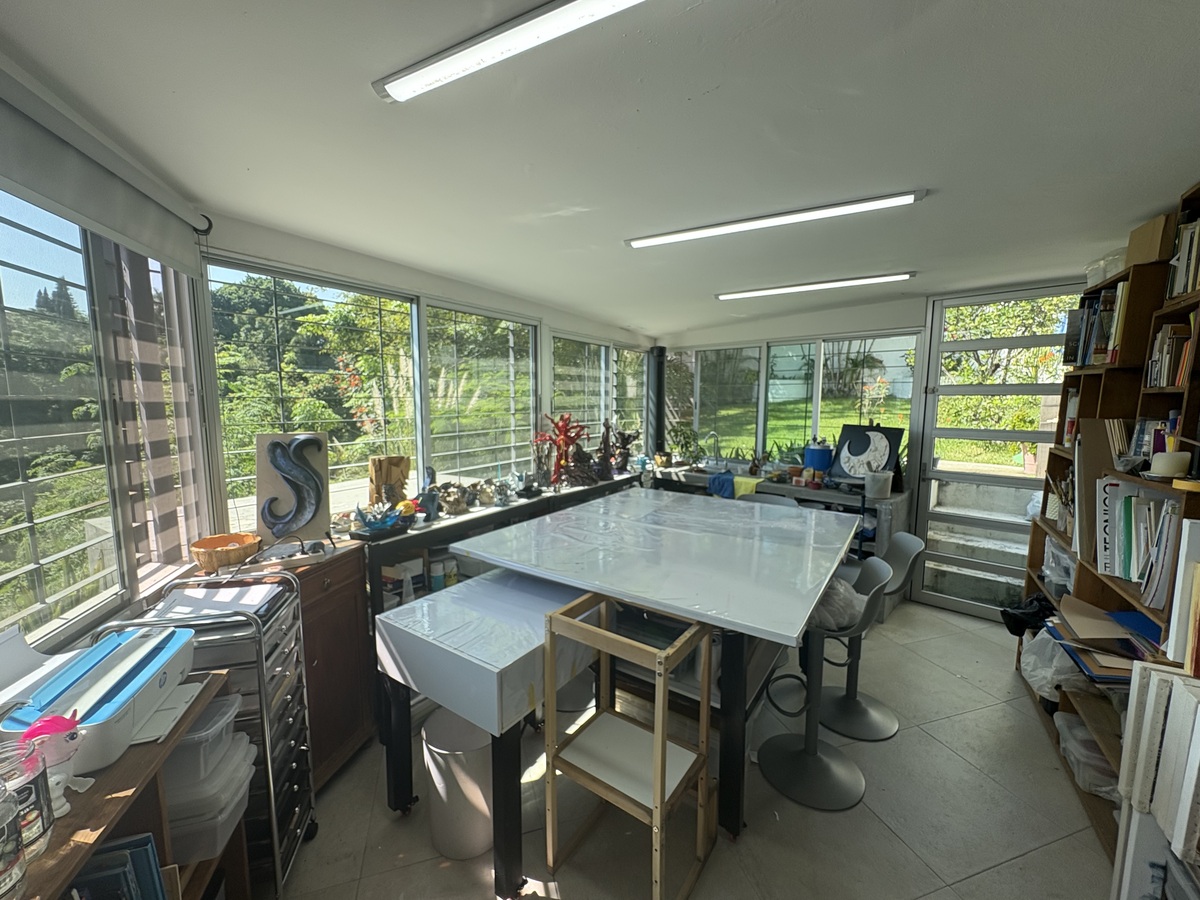 Tiene un lindo estudio que da al jardín de la propiedad y en el jardín hay un medio baño.