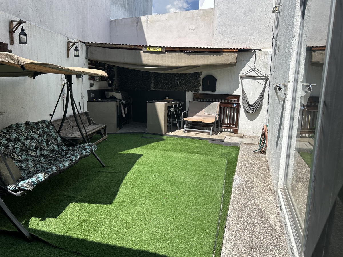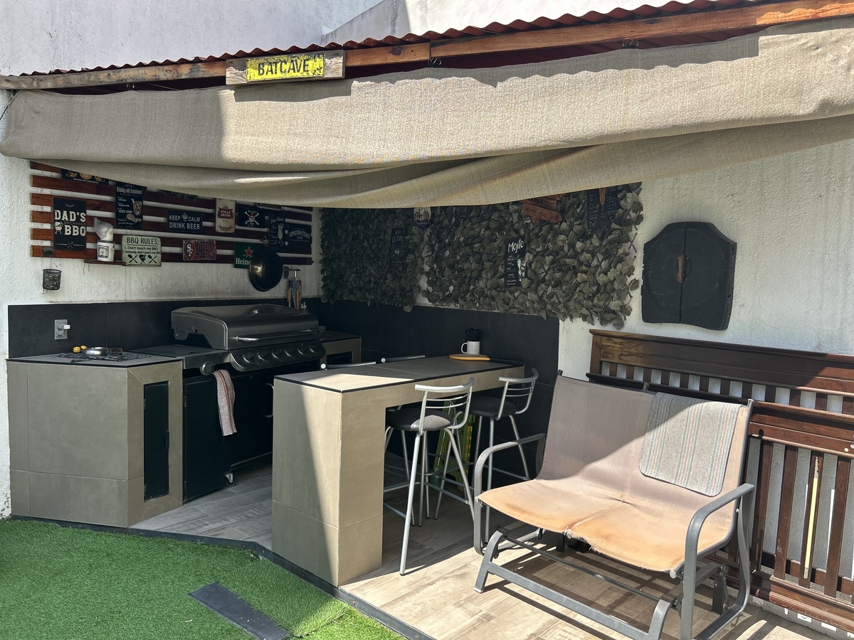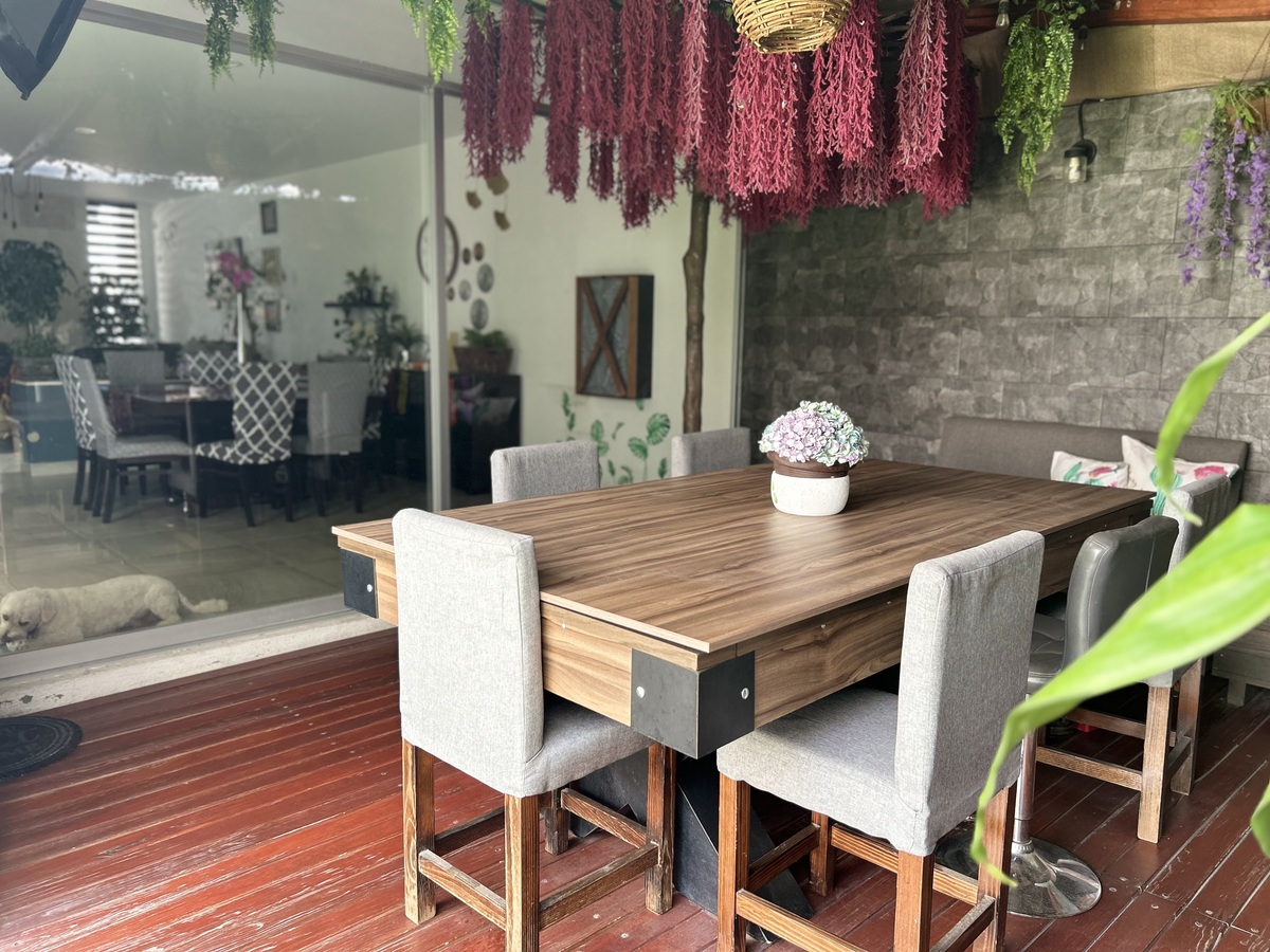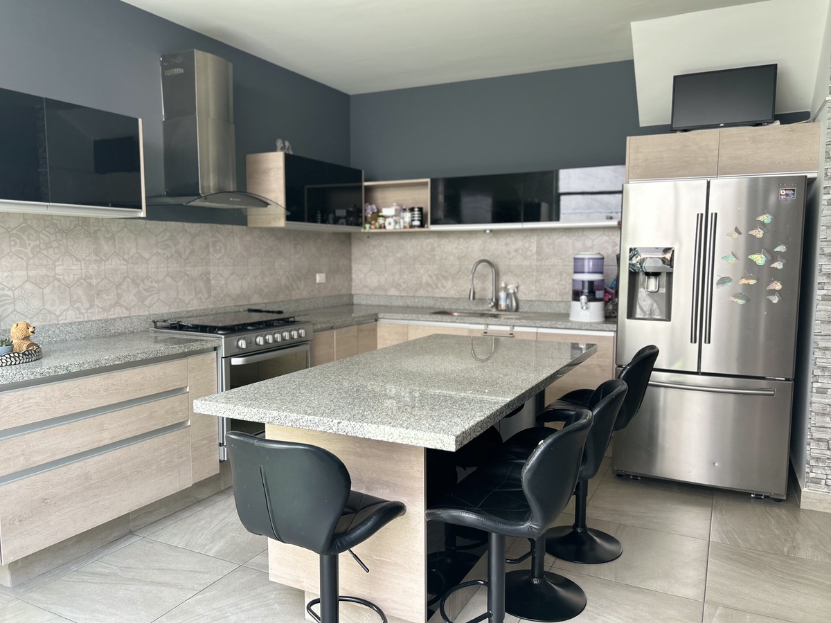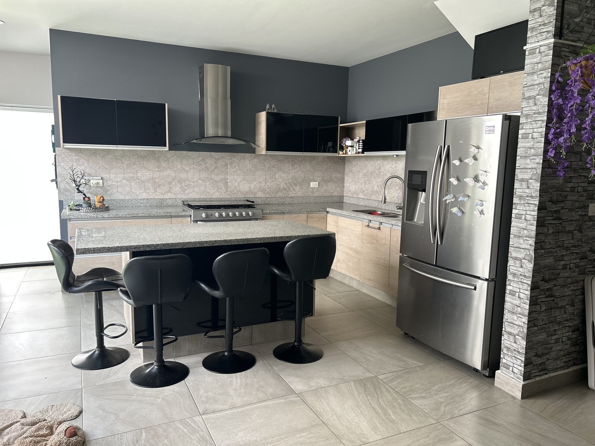 Estacionamiento para 3 vehículos, estudio cerrado o 4ta recámara con baño completo, área de sala y comedor abierto, cocina con isla de granito, pasillo lateral, terraza exterior, jardín y área con asador