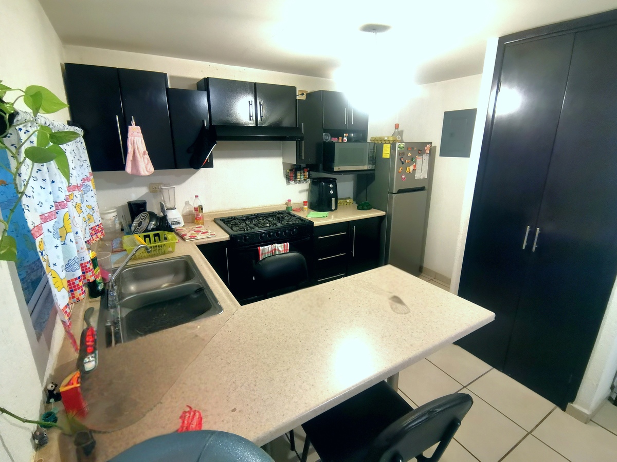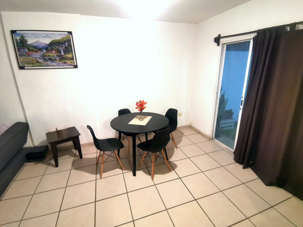 Al entrar a la propiedad encontramos en planta baja, el espacio de sala-comedor, un medio baño y al fondo una cocina integral. Mientras que la parte trasera de la casa cuenta con un patio y área de lavado.