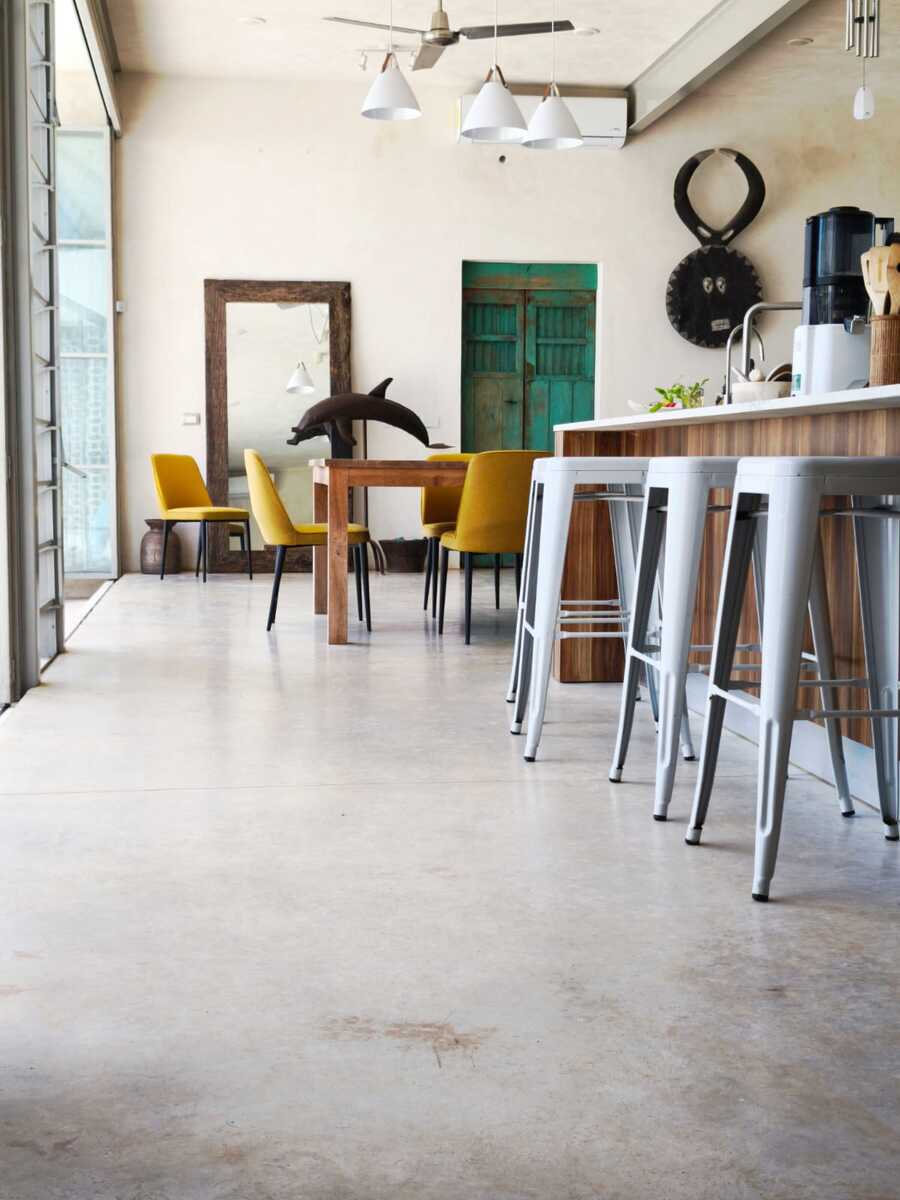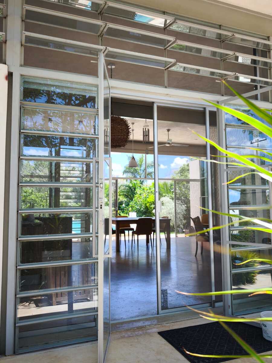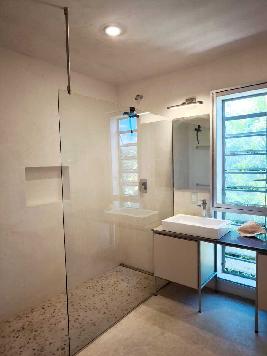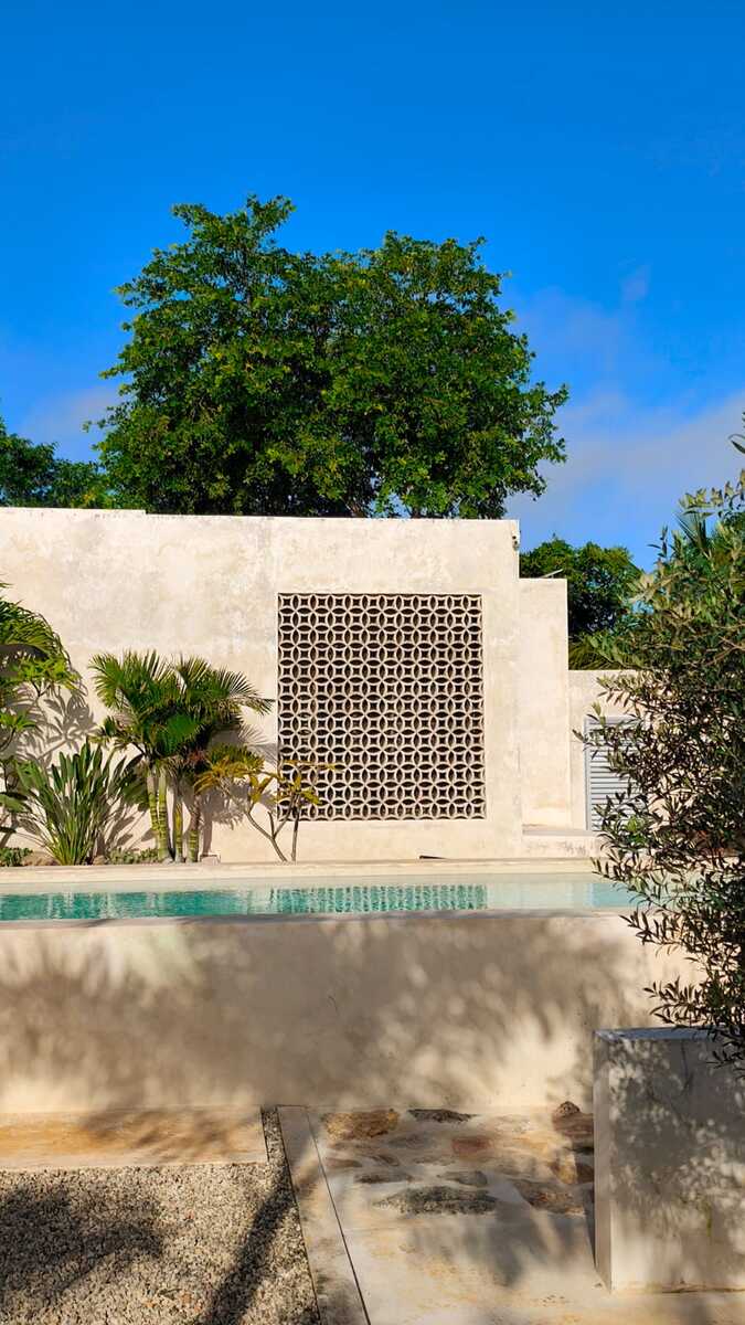 Diseño arquitectónico contemporáneo, con amplios ventanales, integración interior-exterior y acabados naturales en piedra y chukum que realzan la frescura y elegancia del espacio.