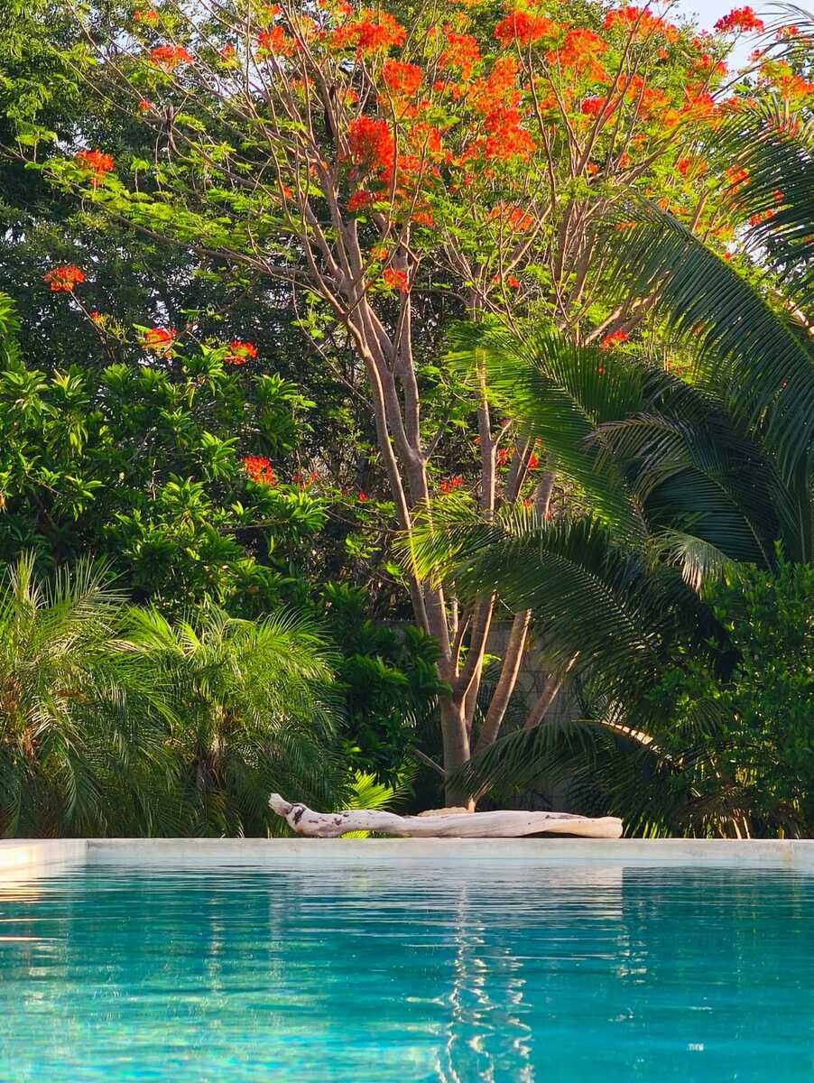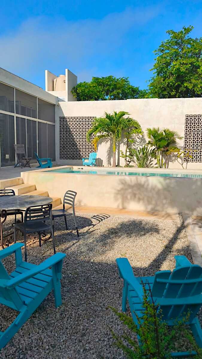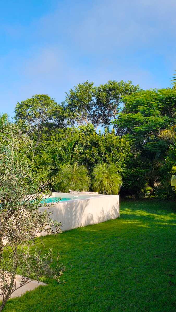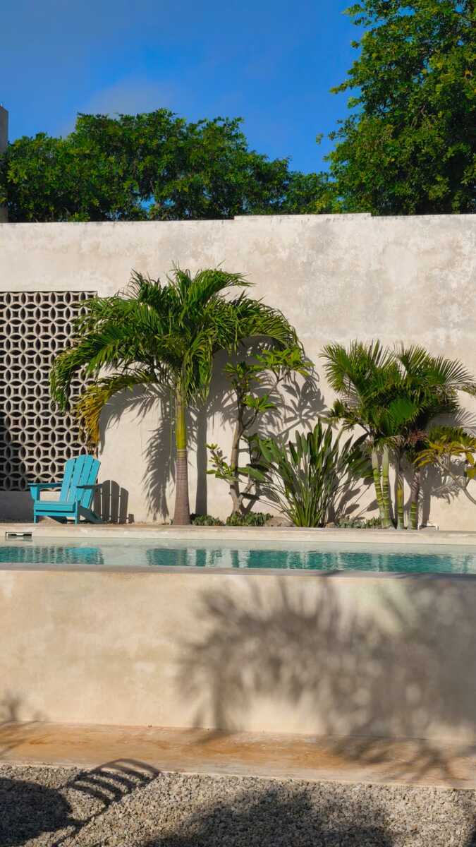 Piscina tipo canal de nado (3 x 15 m, profundidad de 1.40 a 2.40 m) con acabado en chukum, iluminación subacuática y filtración solar automática