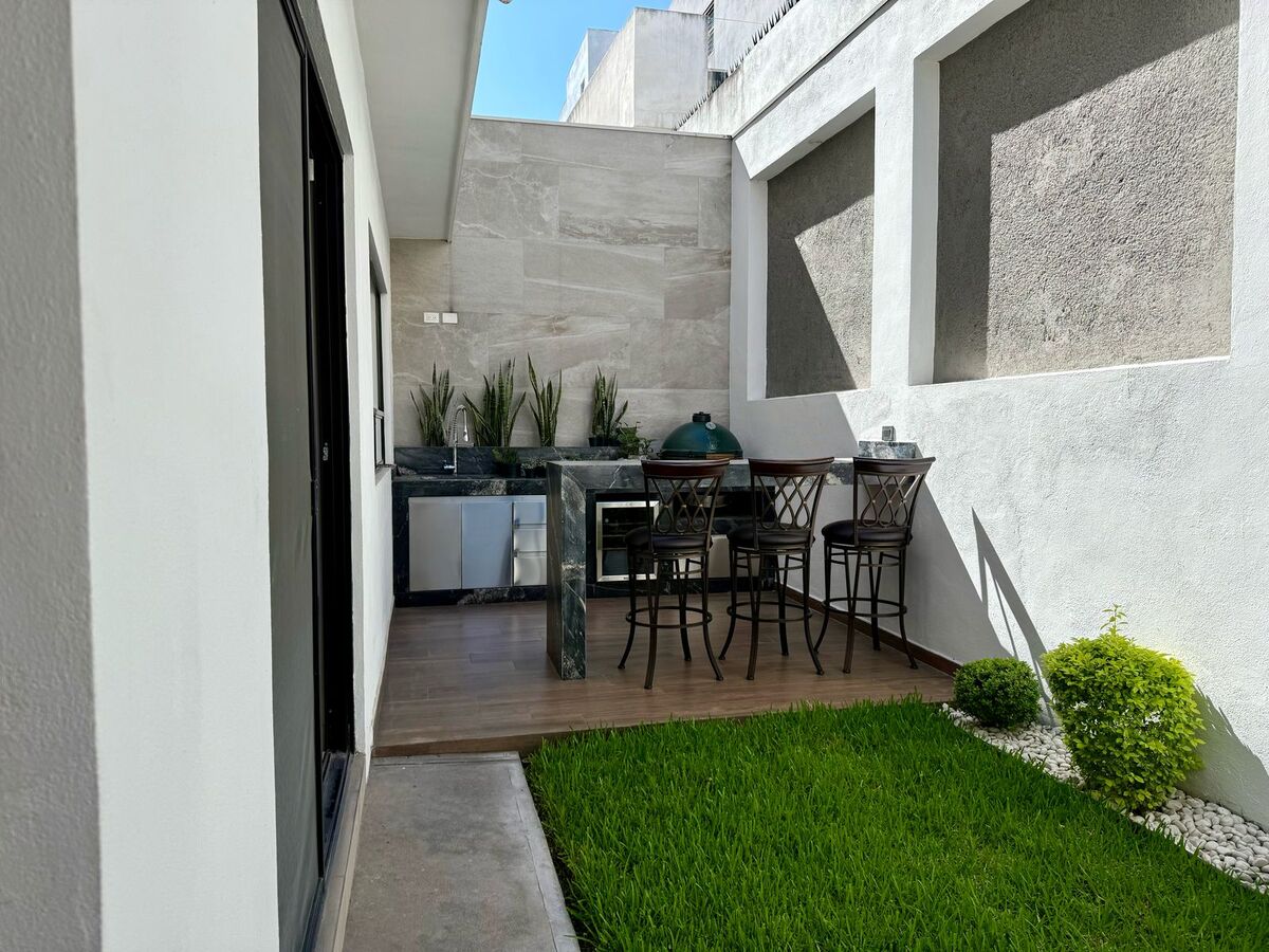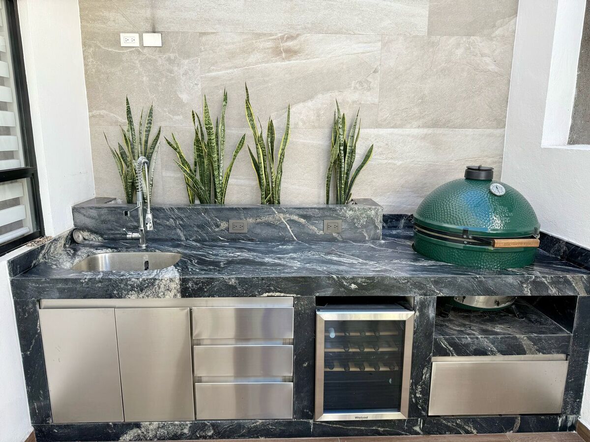 *Patio con barra de asador de lujo: granito exótico, cajones de acero inoxidable y preparación para empotre de green egg. El patio cuenta con riego automático.
