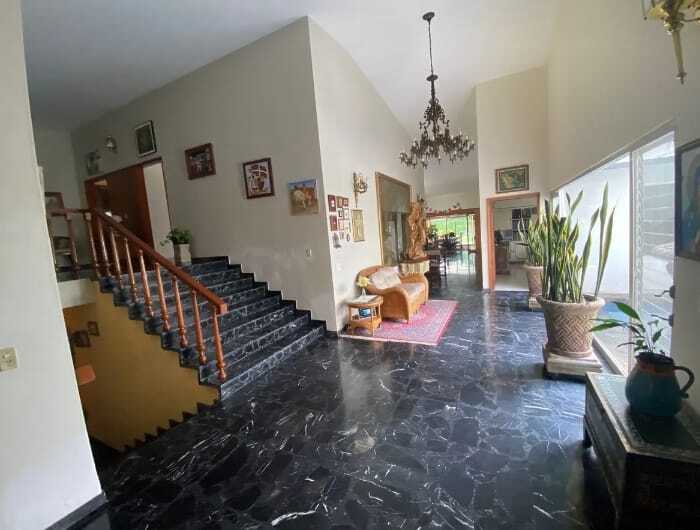 Recibidor que comunica a la escalera del medio sótano (cochera), escalera a distribuidor de 4 recámaras todas con closet, 2 con baño y 2 comparten baño con closet de blancos, cubo de luz con una gran fuente de cantera, cuarto de TV, amplio pasillo, bóveda en doble altura que baja en 2 aguas a un segundo recibidor o estar, baño de visitas, cubo de luz con jardín, sala, comedor, antecomedor con puertas corredizas de cristal a la terraza y jardín, cocina integral con cubiertas de granito y despensa, escalera a segundo nivel con segunda despensa, amplio cuarto de servicio para dos personas, closet y baño, cuarto closet y área de planchado, cuarto de lavado y patio de tendido.