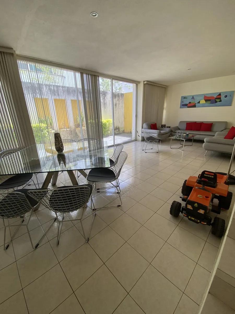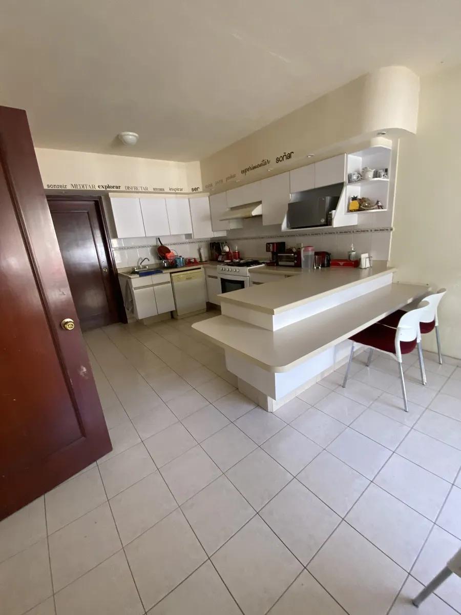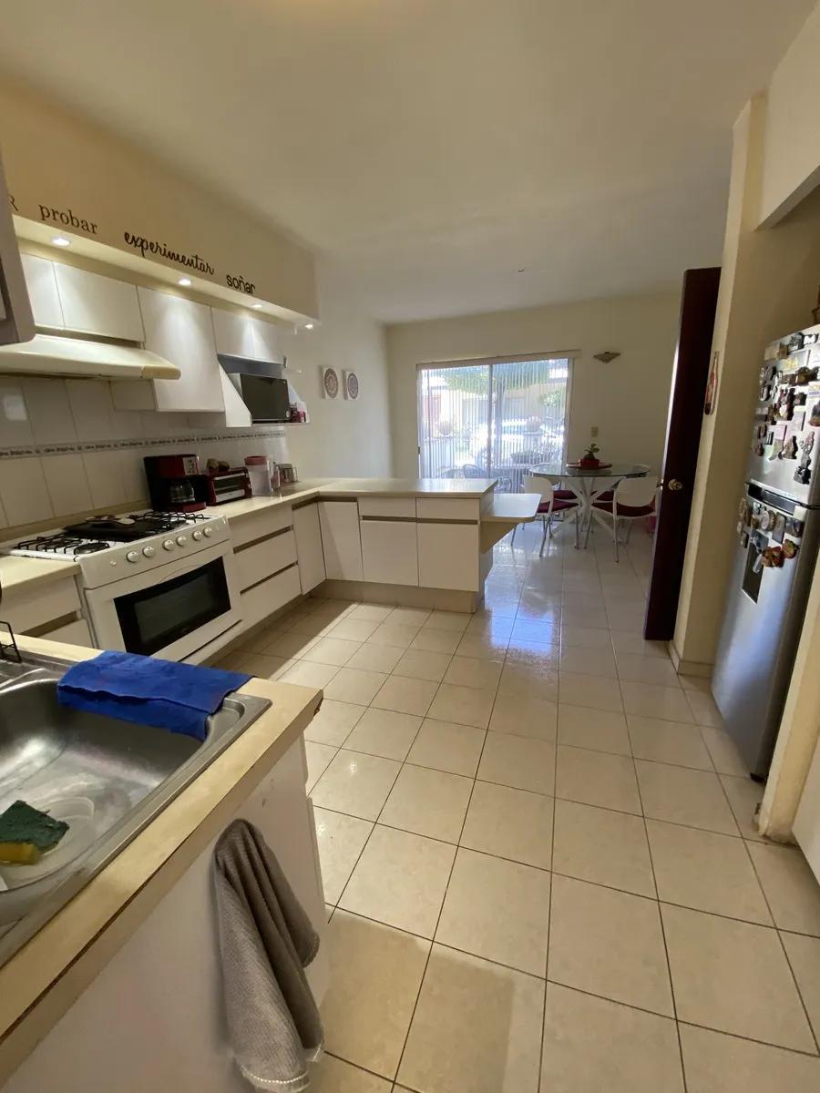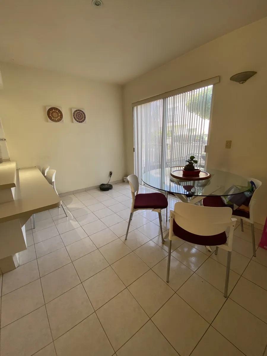 Cochera para 2 autos, medio baño, amplio espacio de sala comedor que se abre a un patio con jardineras, cocina equipada y desayunador. Área de lavado, cuarto de servicio con baño completo y patio de servicio.