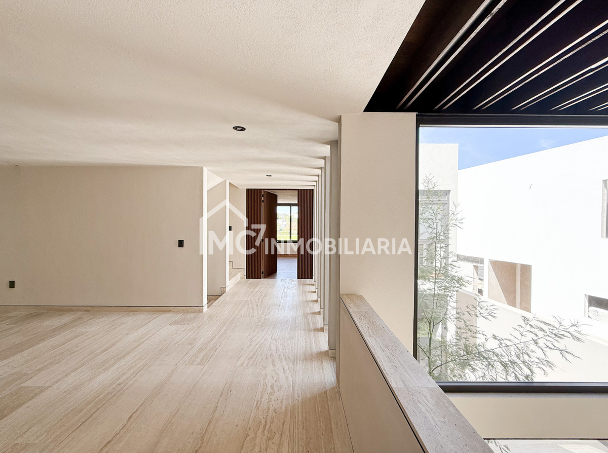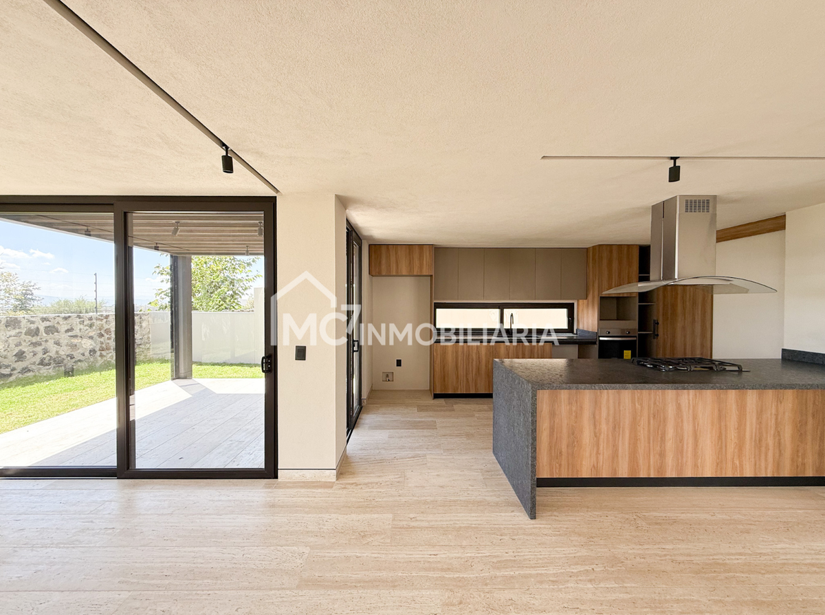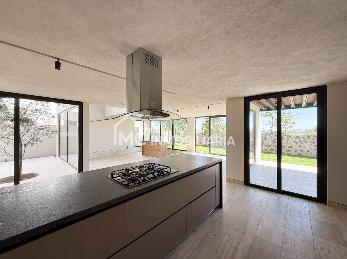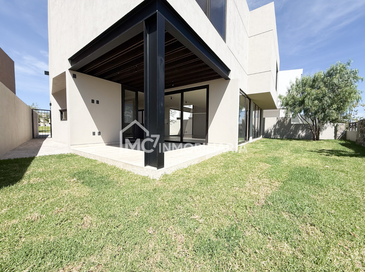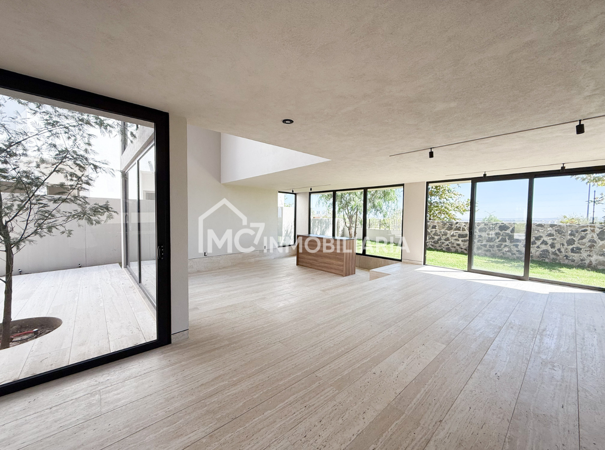 La casa cuenta con 3 recámaras con opción a 4, imponente doble altura que integra a la sala, cocina y comedor con un amplio jardín, terraza techada y jardín central que genera una inigualable iluminación natural.