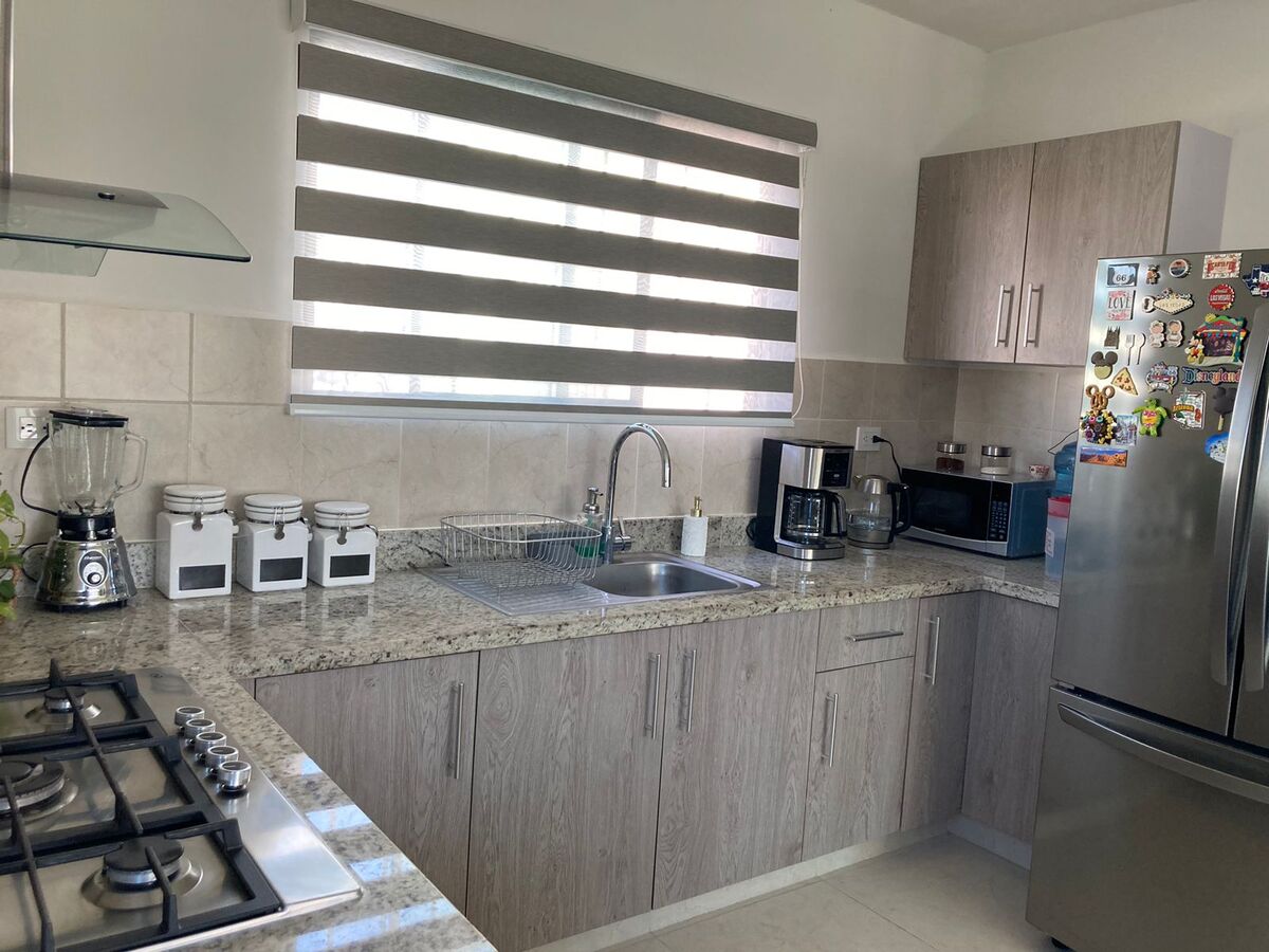Sala, comedor, medio baño de visitas y cocina equipada con estufa y campana de cristal templado, cubierta de granito, alacena y barra desayunador