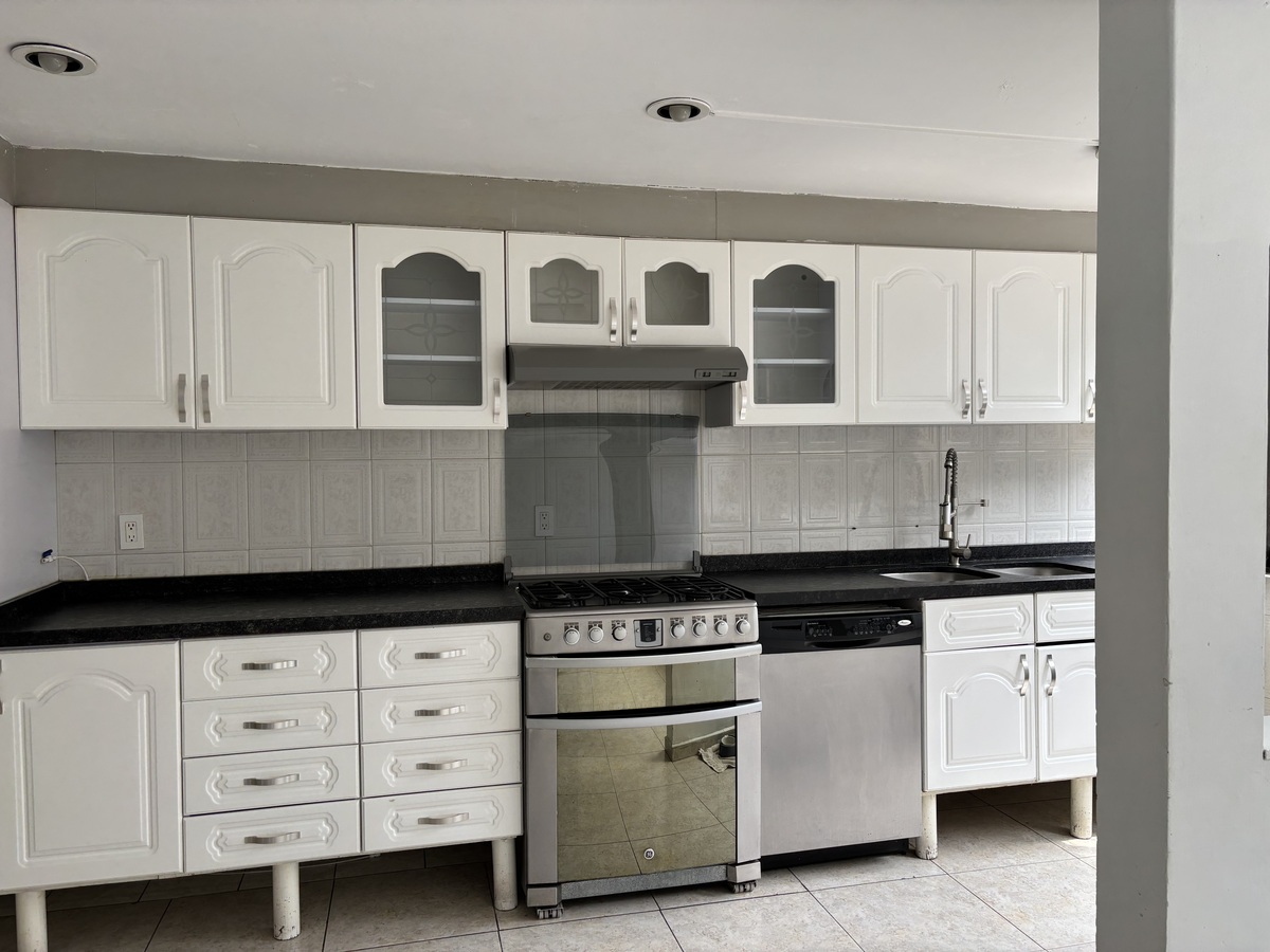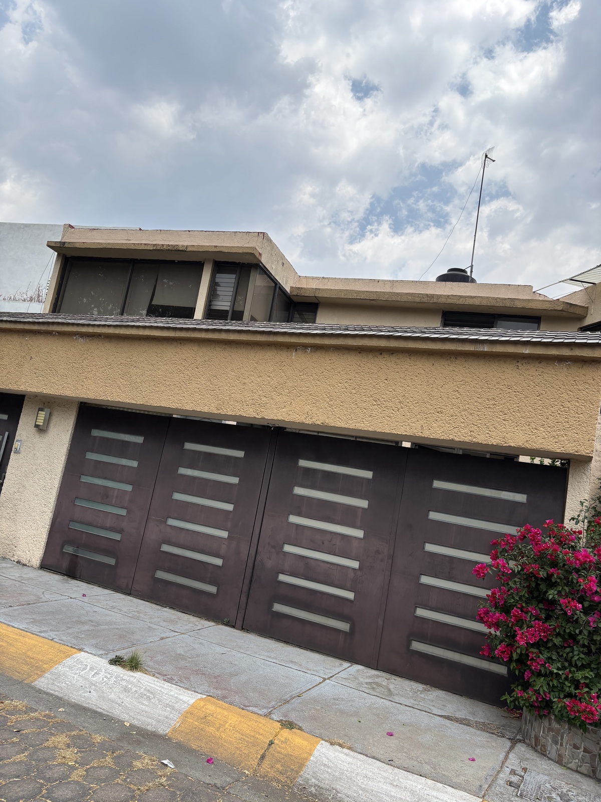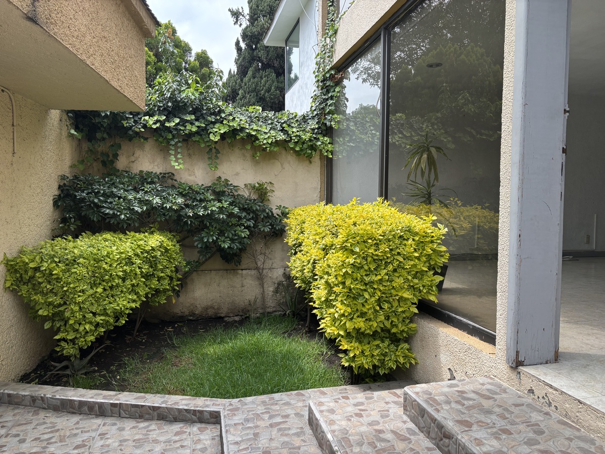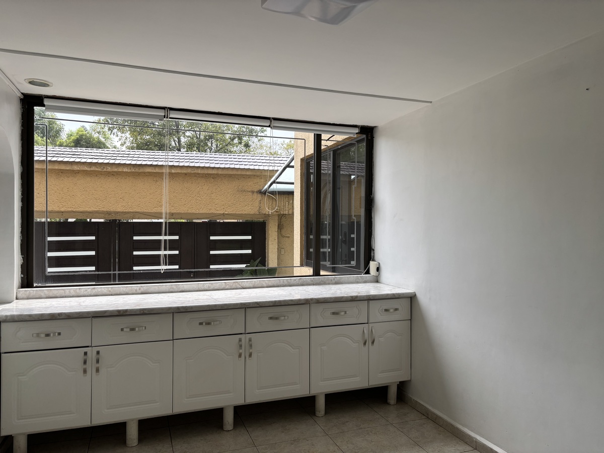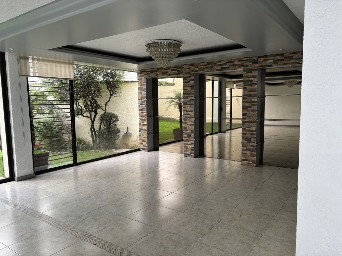 Consta de amplia sala comedor, estudio, baño de visitas, cocina integral, 4 recámaras, 4 baños, cuarto de servicio con baño, cuarto de lavado, 2 estacionamientos, bodega.