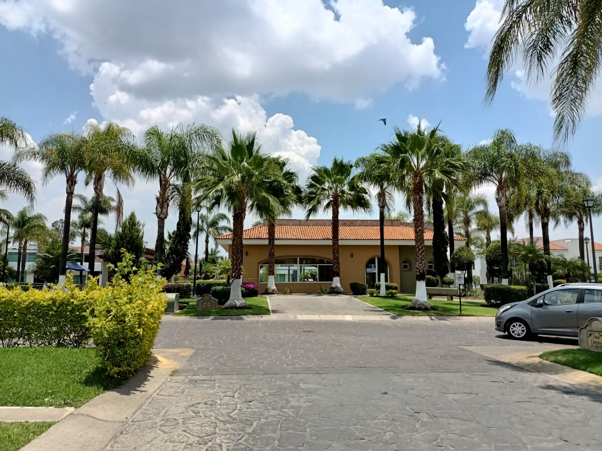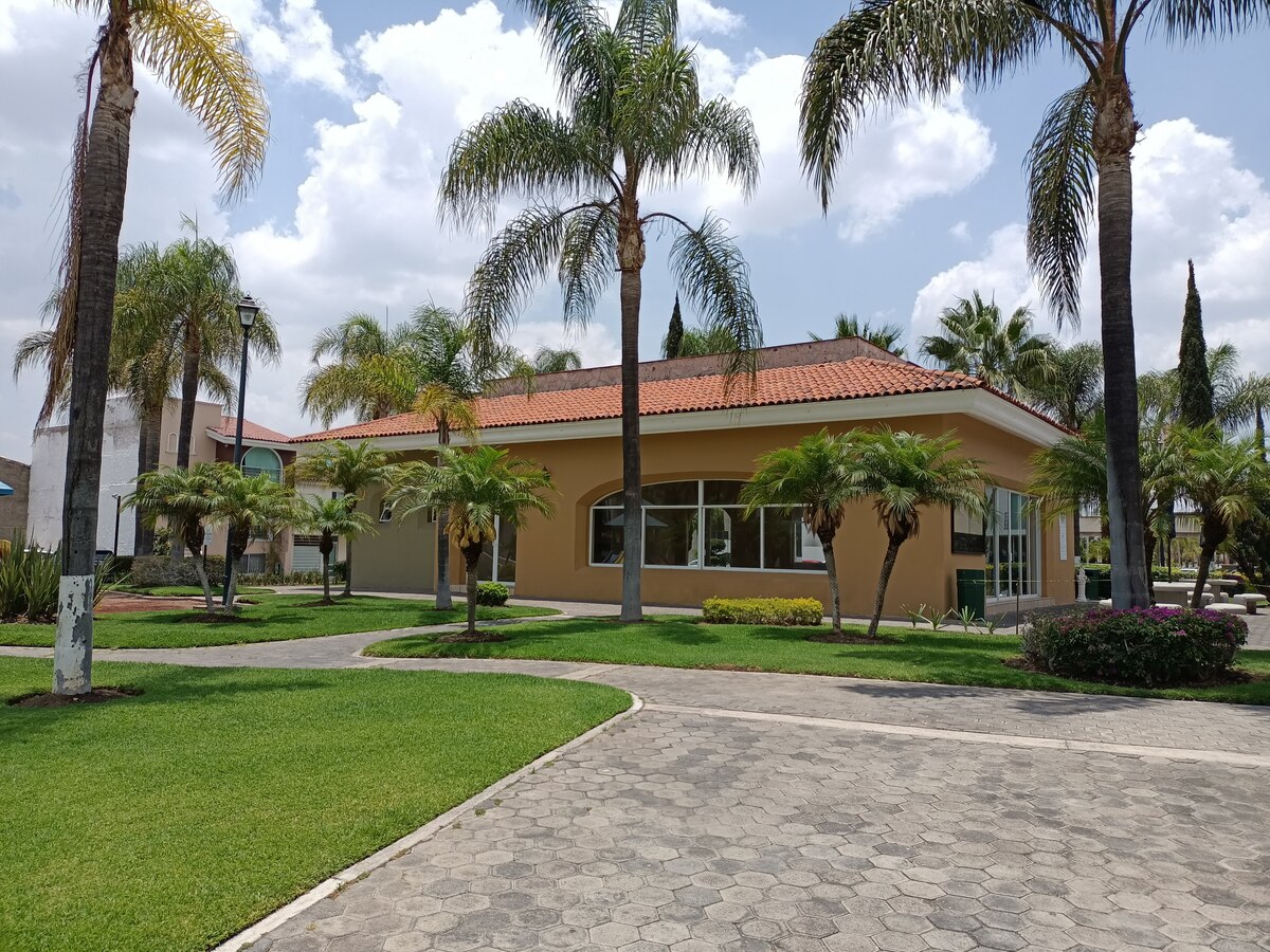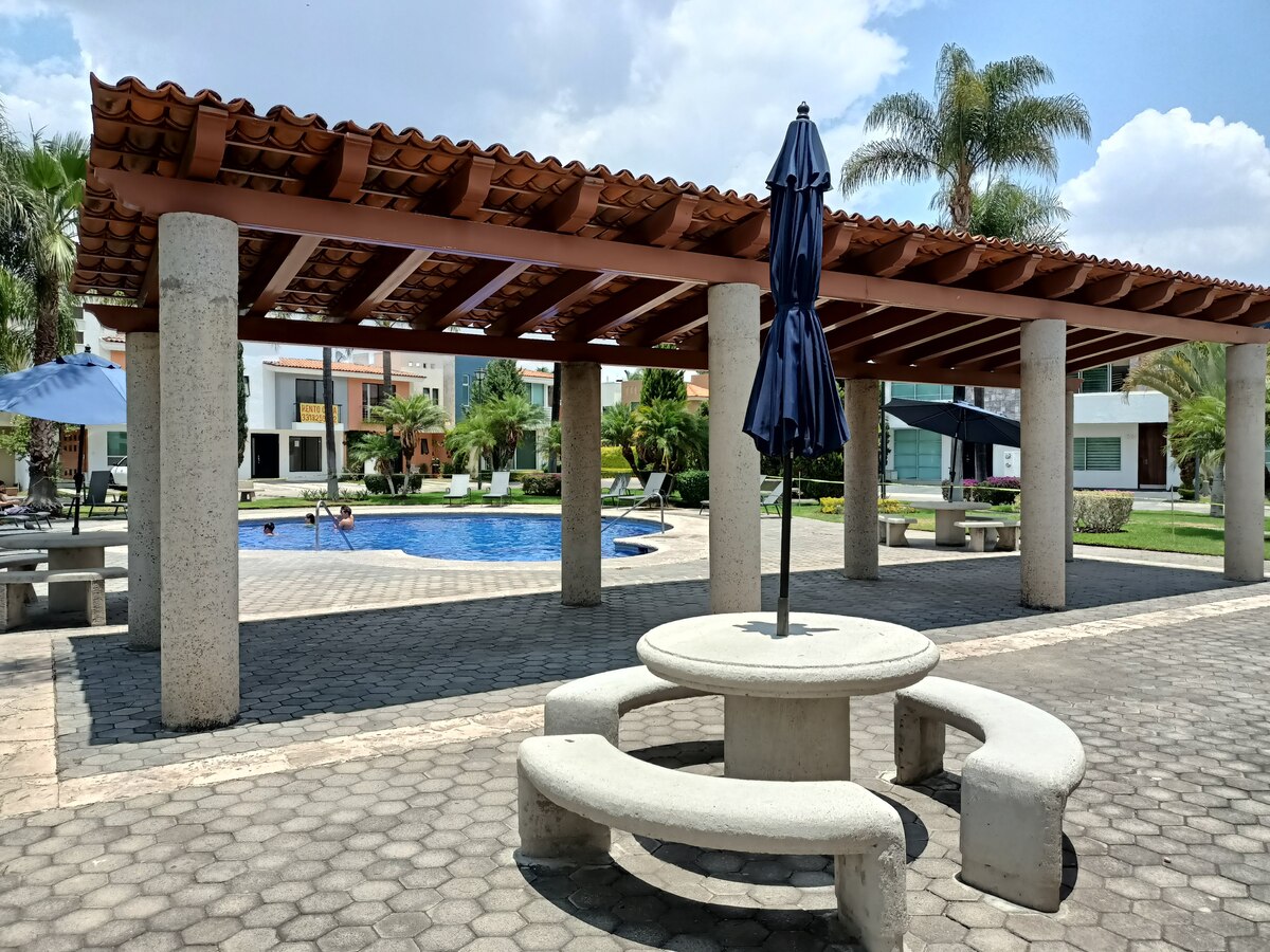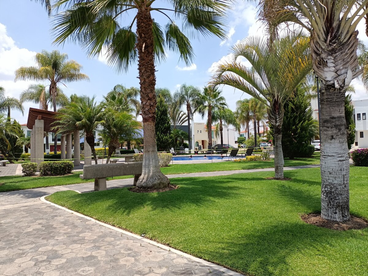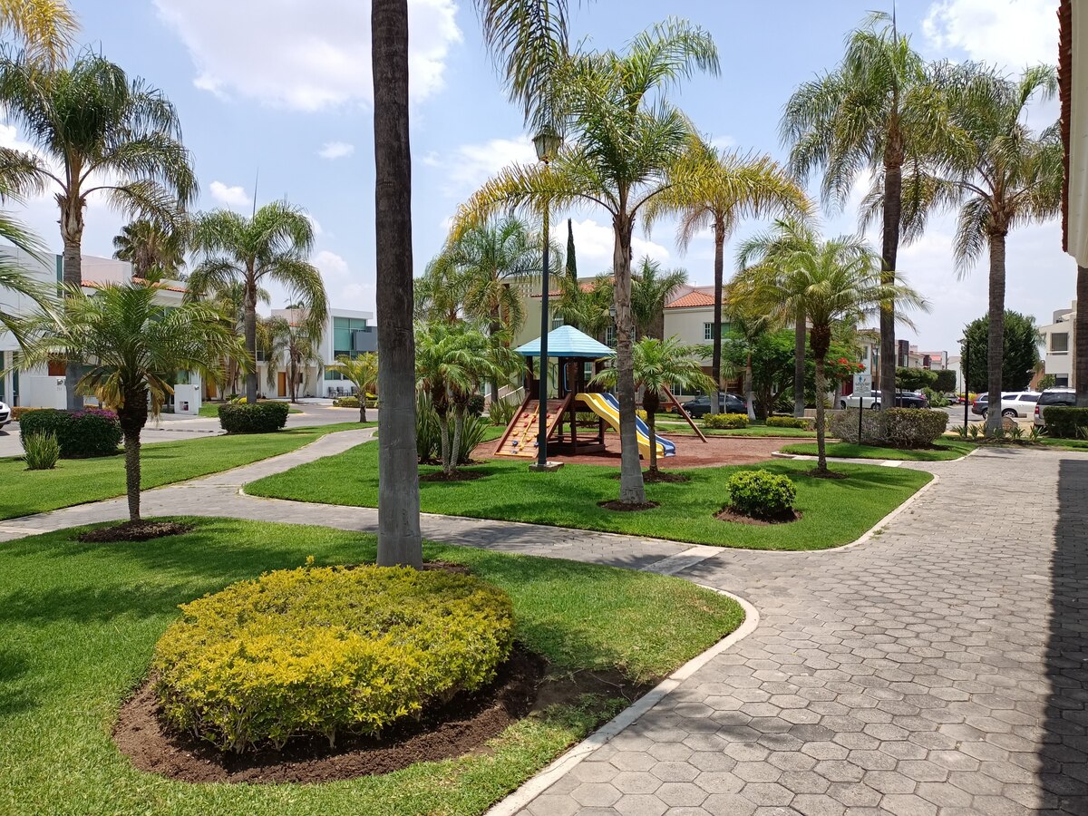 En condominio Toledo tiene doble área común, una con terraza y alberca y al fondo del condominio hay un área para caminar, juegos infantiles, canchas multiusos y unos aparatos para hacer ejercicio al aire libre.