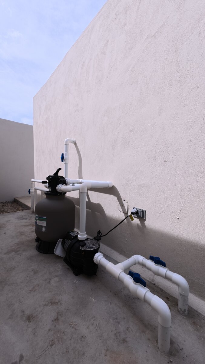 • Piscina con acabado en chukum, cenefa de 15 cm de veneciano, luz LED multicolor, sistema de filtrado y muro de piedra con cascada