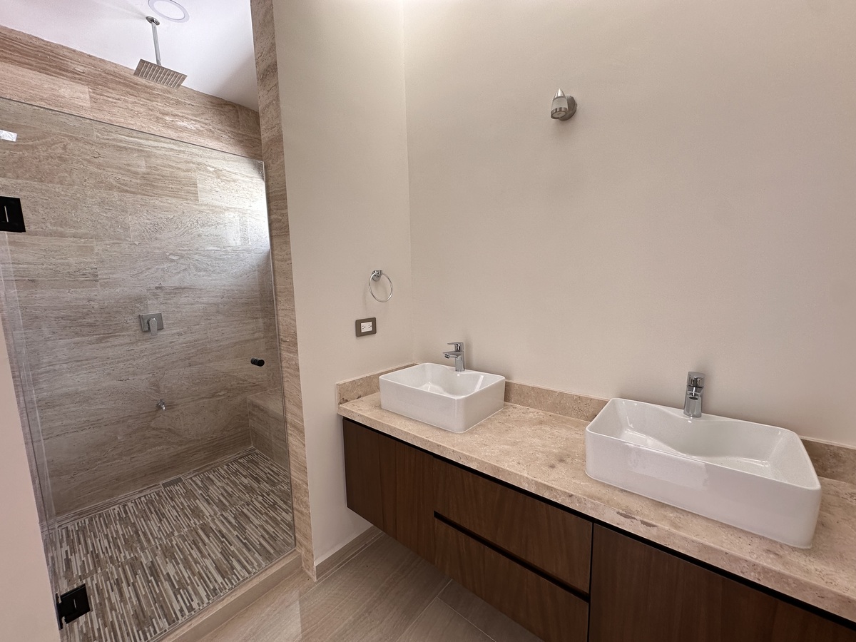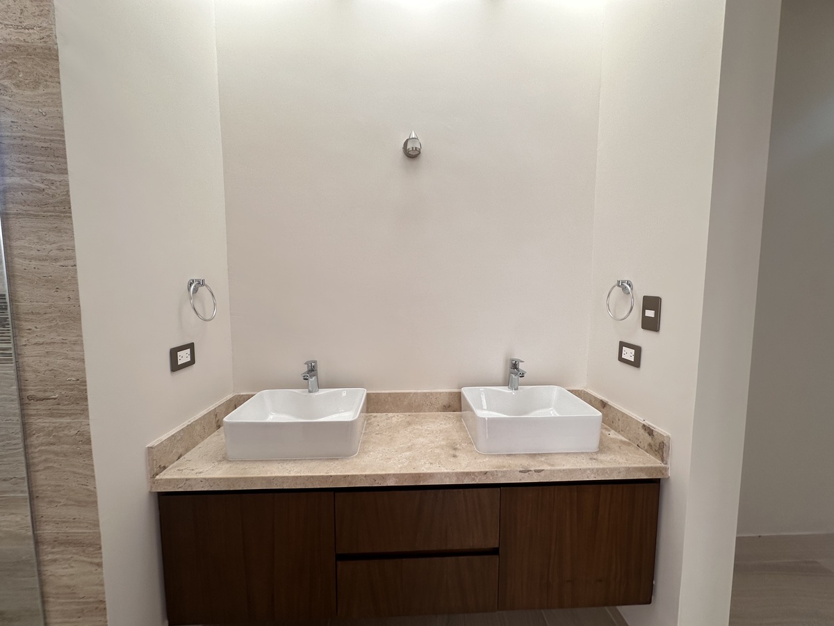 • Mesetas de mármol en baños con lavabos de porcelana y muebles de madera