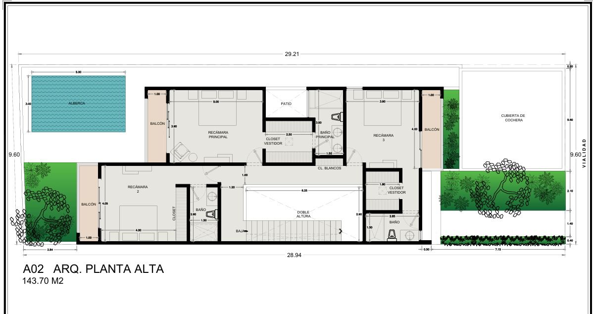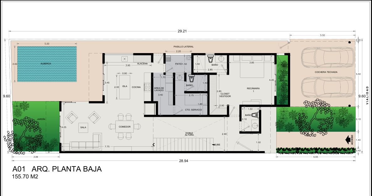 Terraza techada, piscina de 2.80 x 5.50 metros con acabado tipo mosaico, lámpara subacuática y preparada para recibir sistema de filtración.