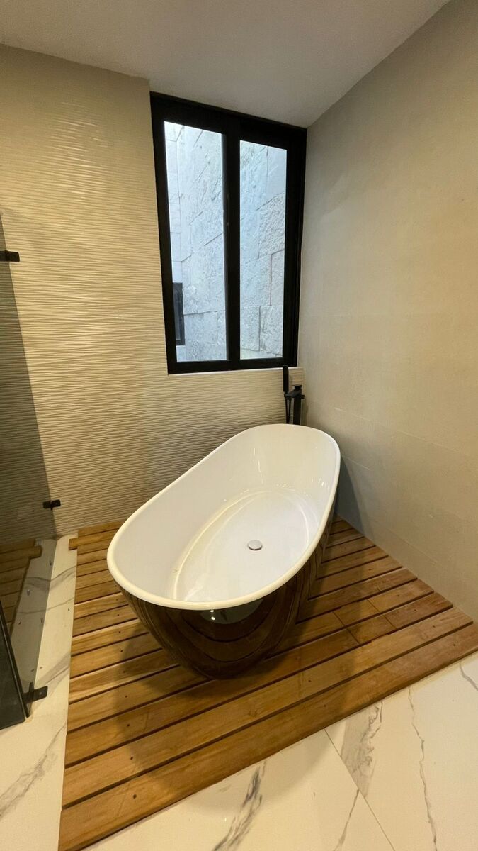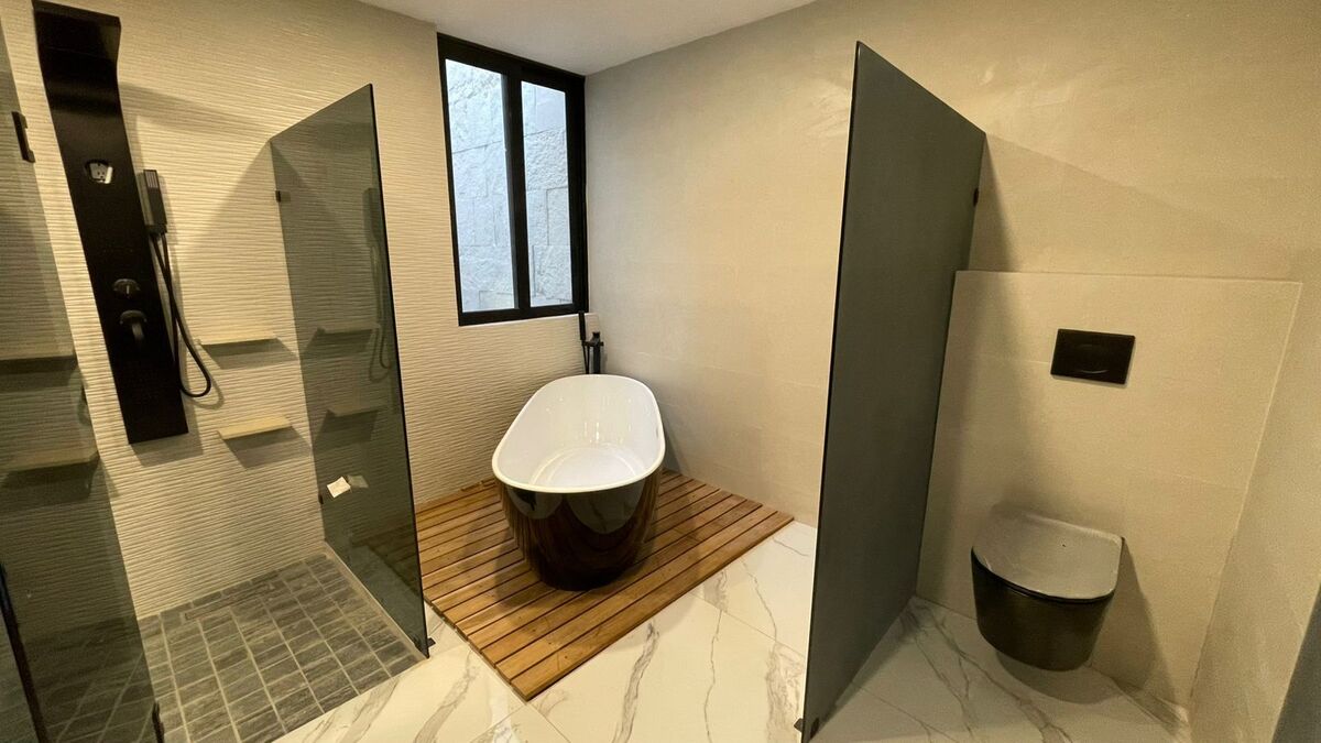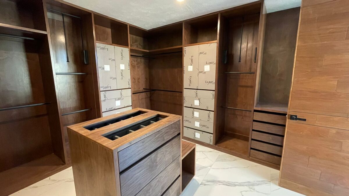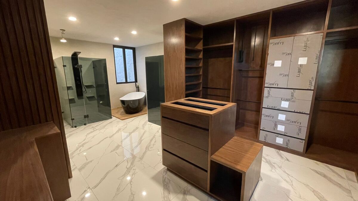 La suite principal es un oasis de lujo, con un amplio baño, una bañera independiente de estilo spa, una ducha de lluvia y un vestidor con iluminación integrada.