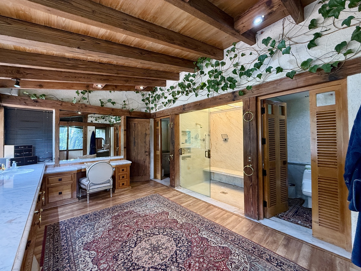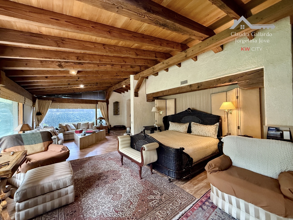La recámara principal es especialmente espaciosa y cuenta con ambientes adicionales como su propia sala de TV con chimenea, un área designada para gimnasio y un vestidor de gran capacidad.