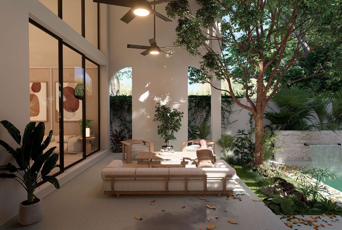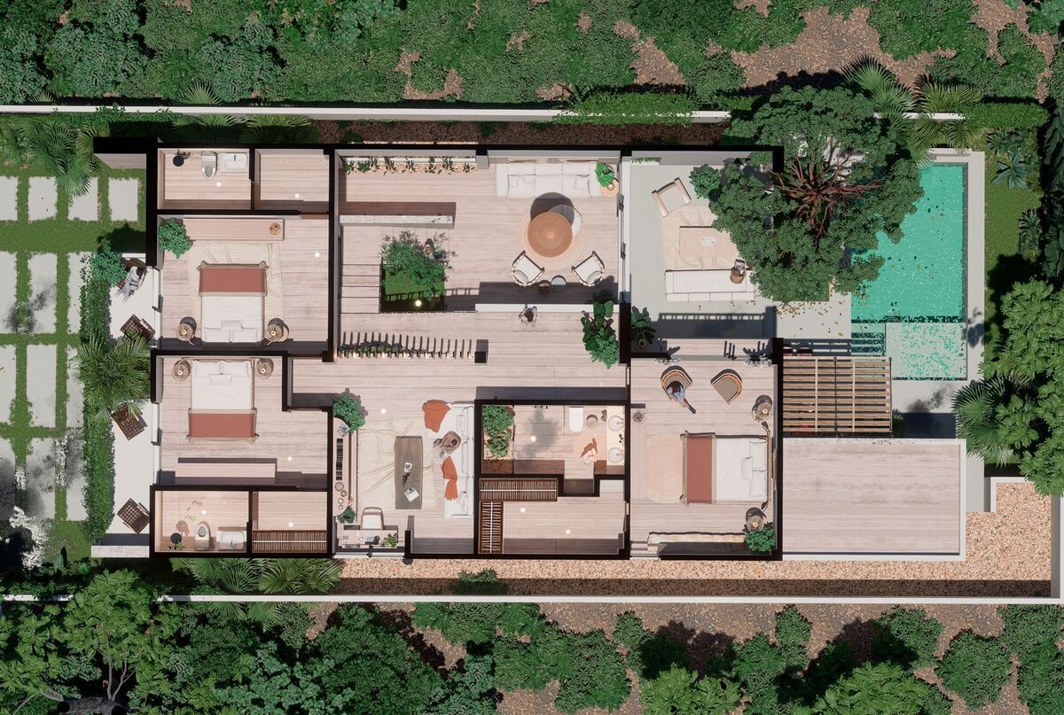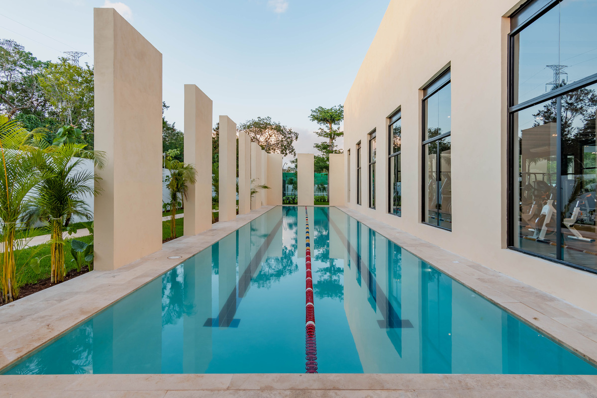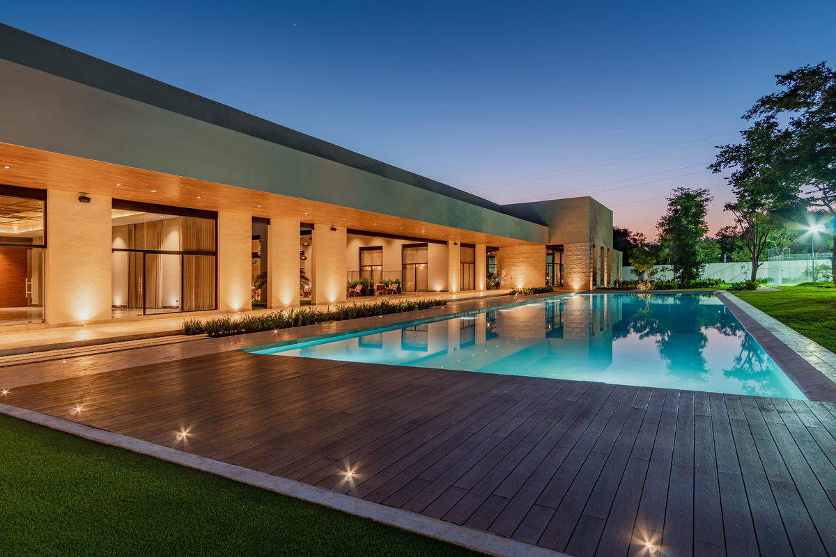 La casa cuenta con 4 recámaras más un family room, todo diseñado bajo el estilo mediterráneo conremporáneo, que combina materiales como el mármol travertino, la piedra de cantera galarza, el cuarzo y chukum, dando una combinación de tonos neutros cálidos y armoniosos.
