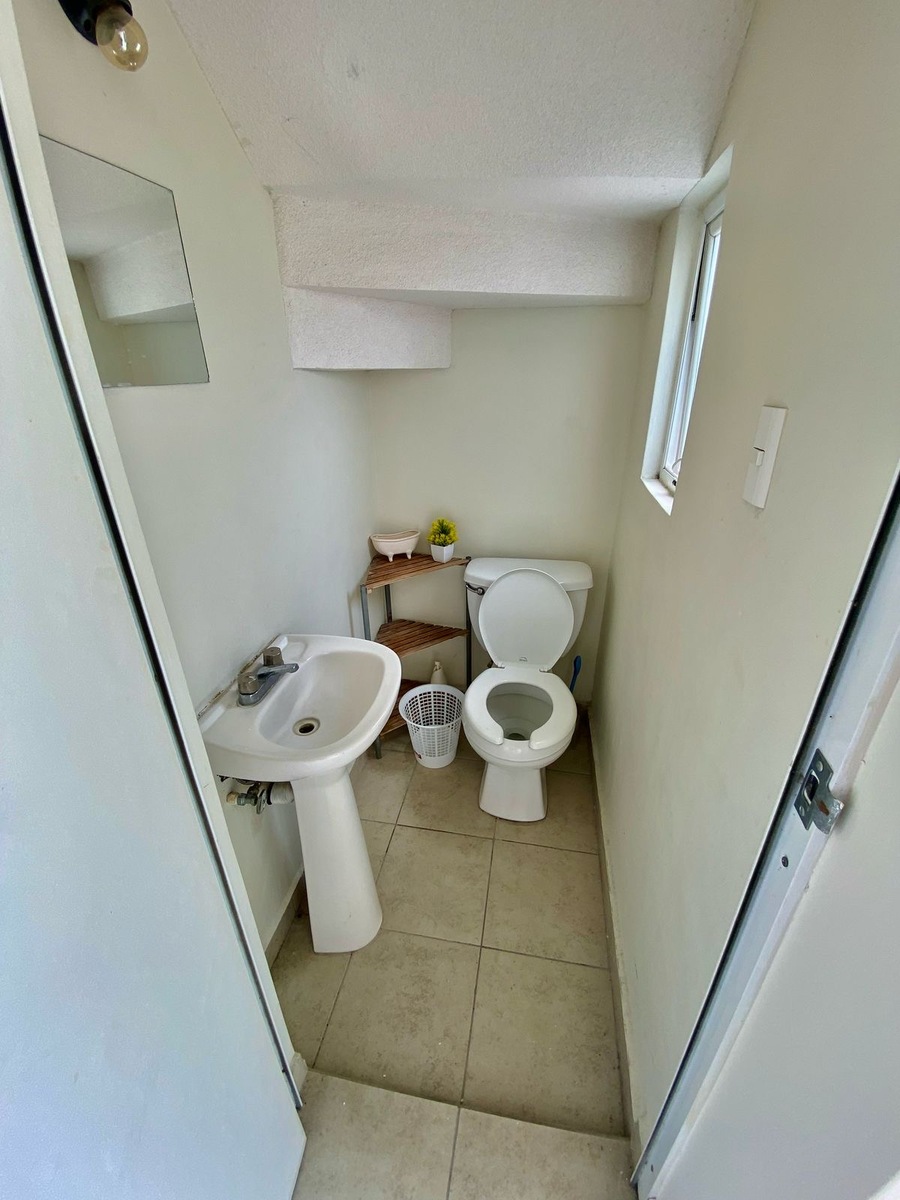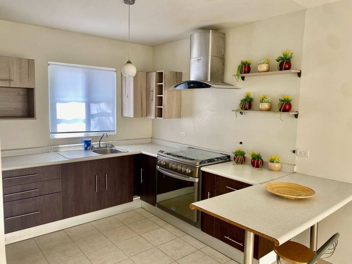 Estacionamiento, medio baño de visitas, cocina con barra, sala, comedor y patio
