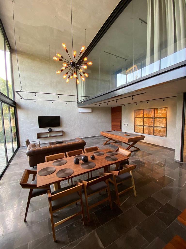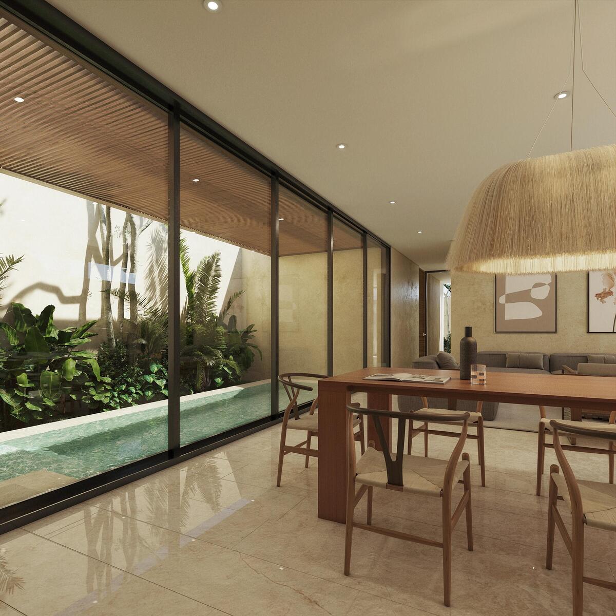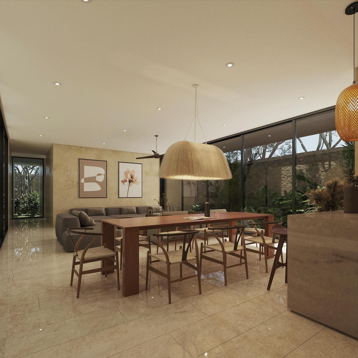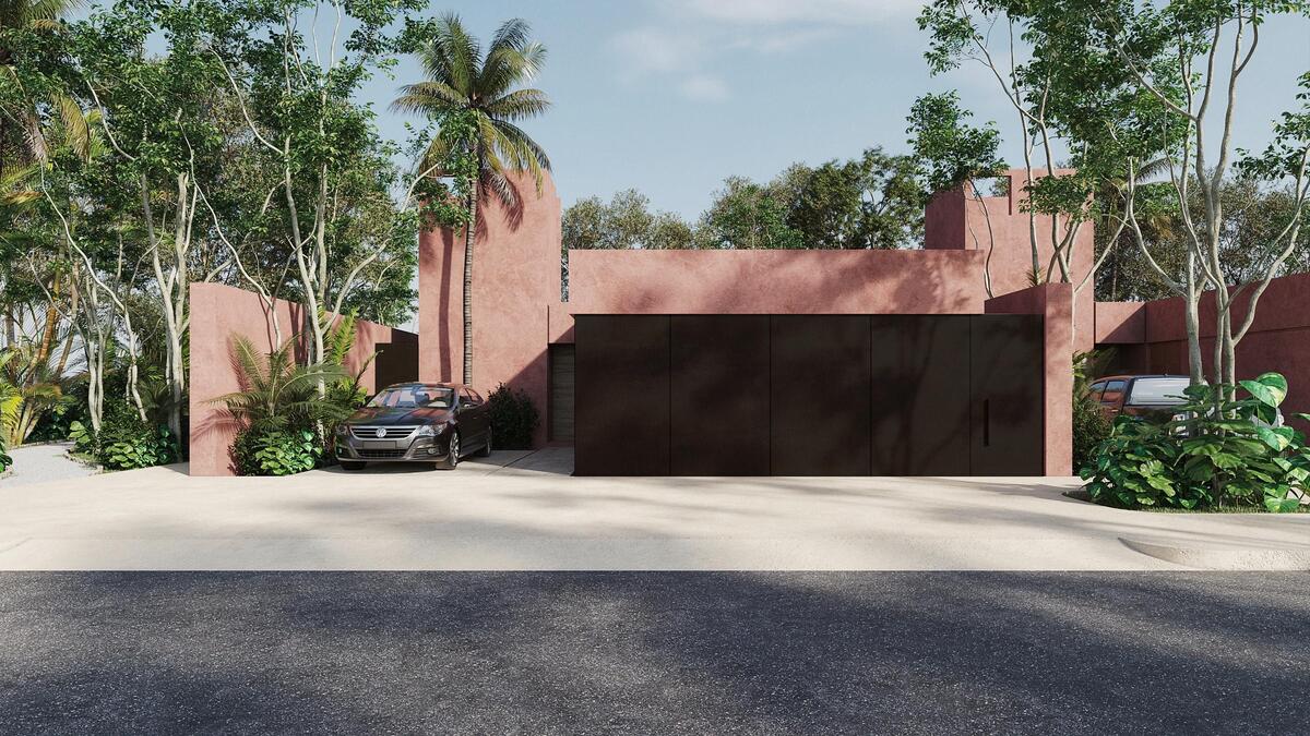 La casa está ubicada dentro de la Privada Aventa rodeada de exuberantes jardines y paisajes cuidadosamente diseñados. La fachada presenta un diseño arquitectónico moderno con líneas limpias y acabados de alta calidad que reflejan el lujo y la elegancia.