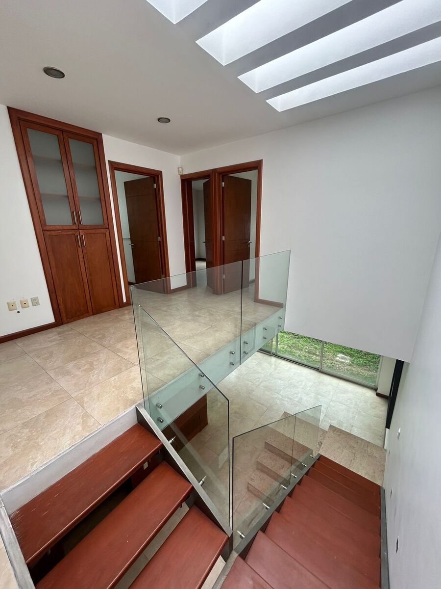 Cocina integral con barra amplia, Escalera de madera a doble altura, sala comedor amplia con mucha iluminación con vista al jardín, acabados de madera y mármol, cuarto de lavado cisterna, bodega, cuenta con entrada lateral al jardín, cochera para dos autos.