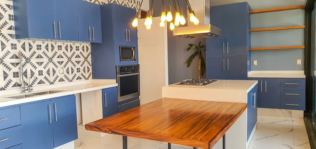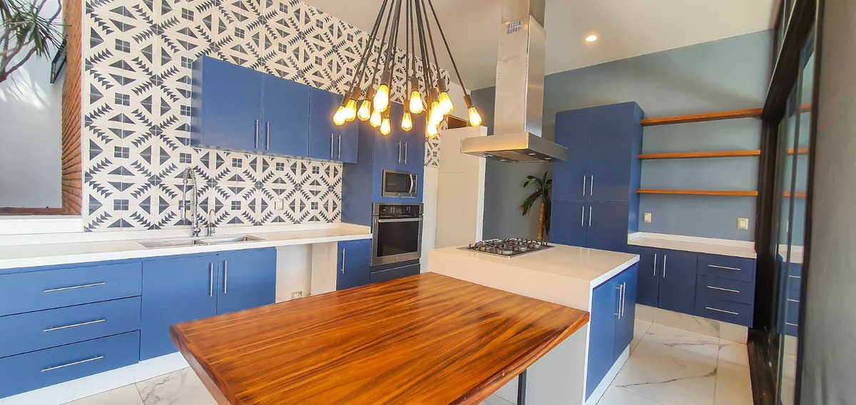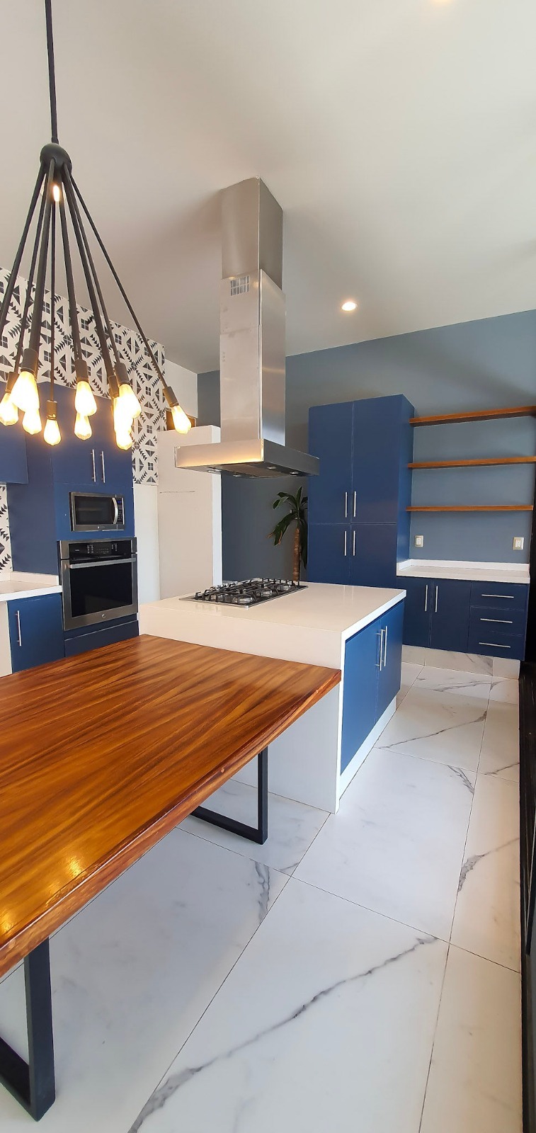 Cocina integral equipada con campana, estufa, filtro de agua, horno y mesa de madera