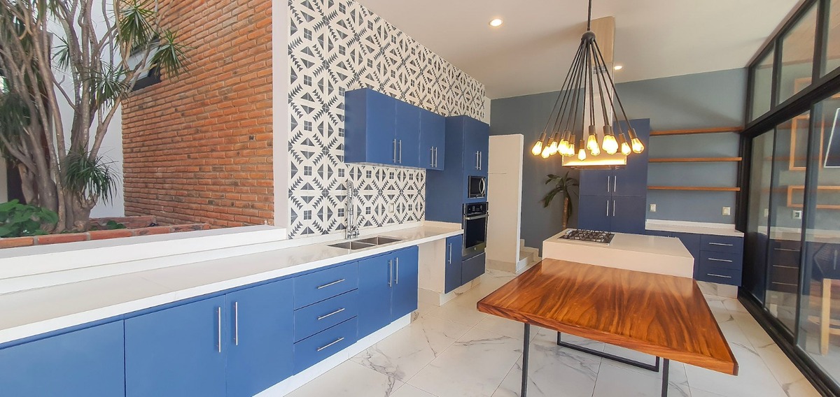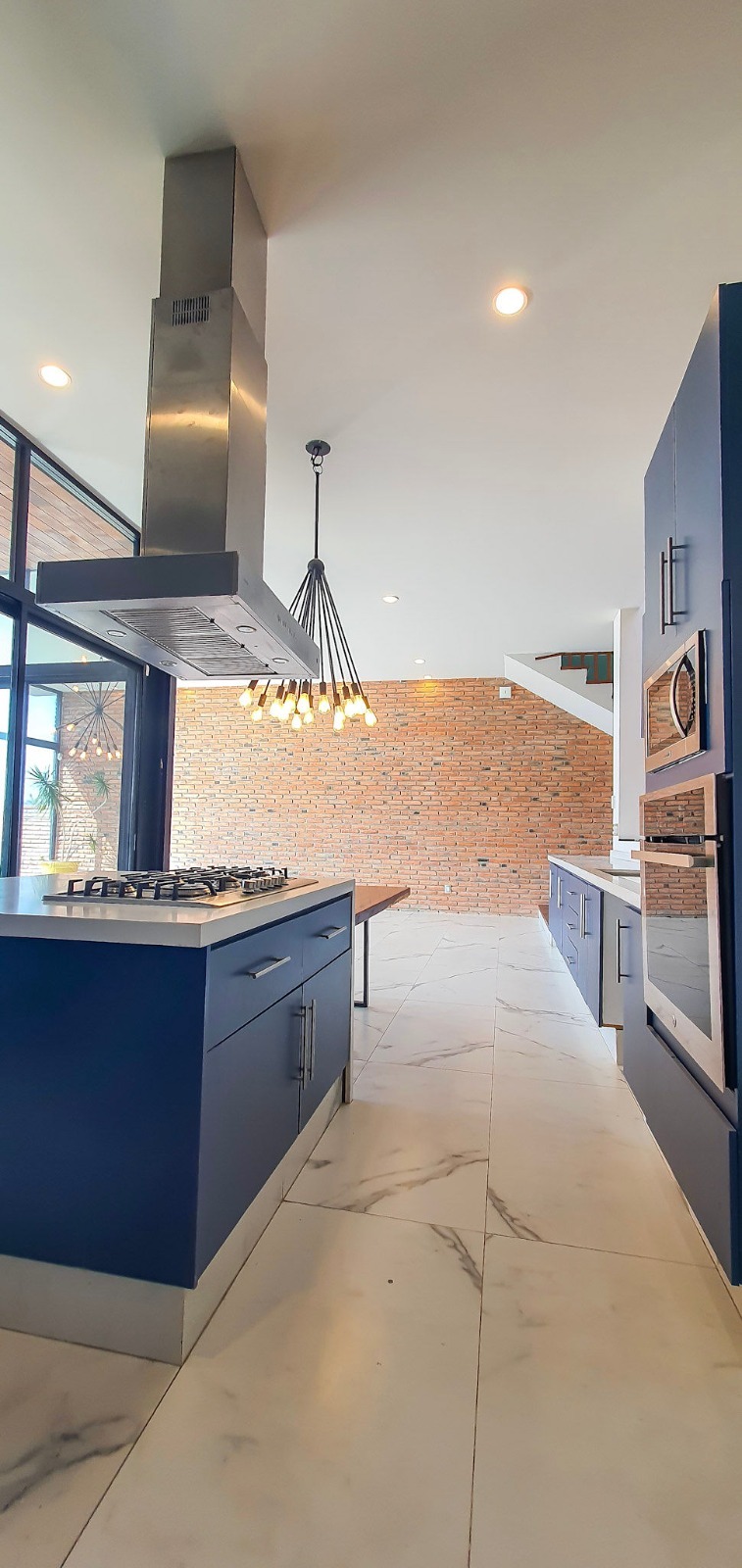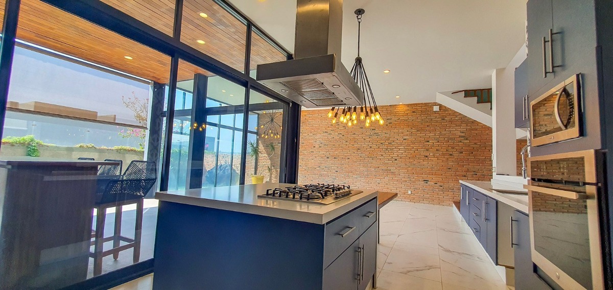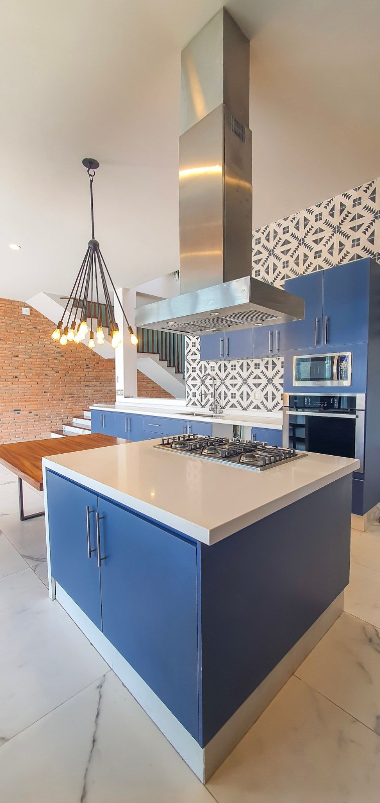 Cocina integral equipada con campana, estufa, filtro de agua, horno y mesa de madera