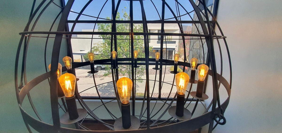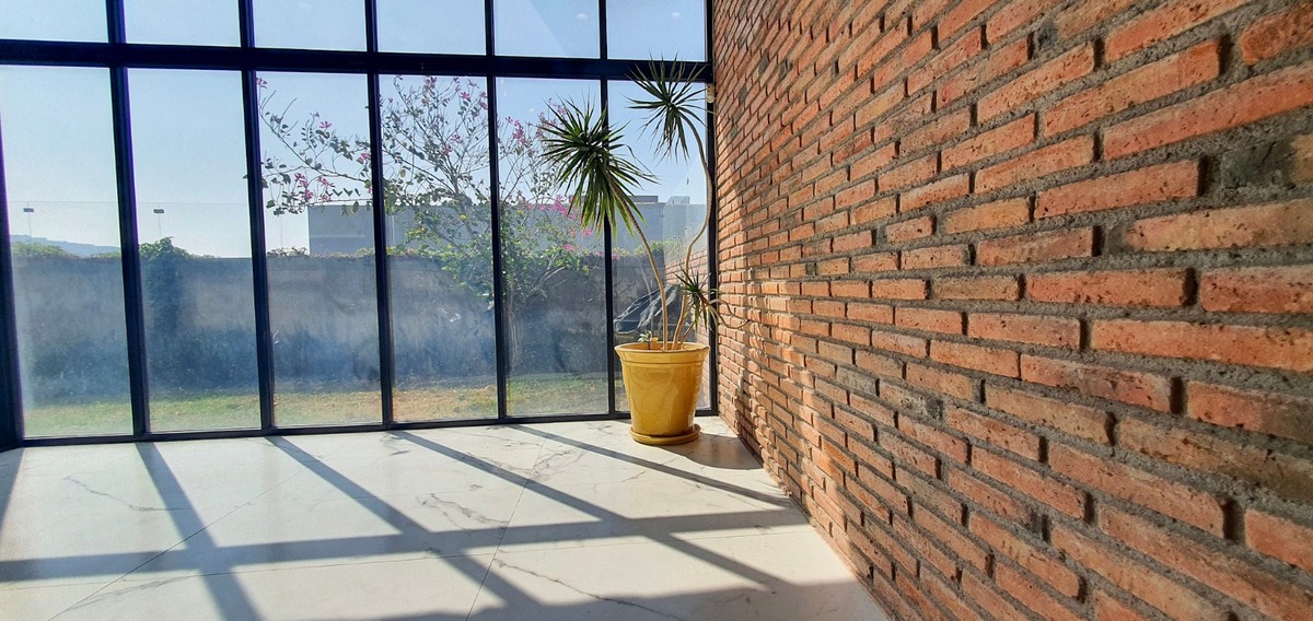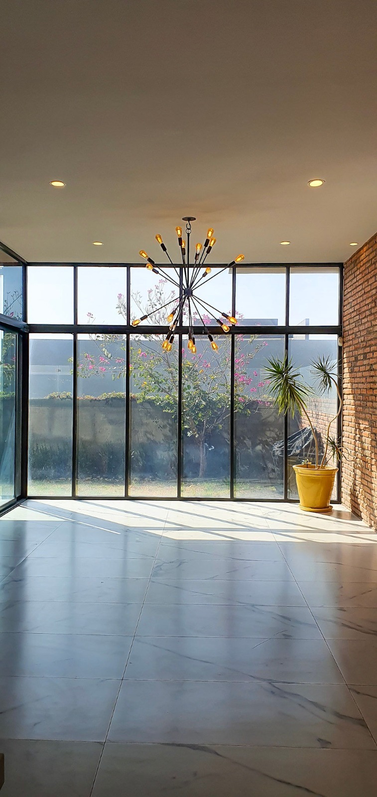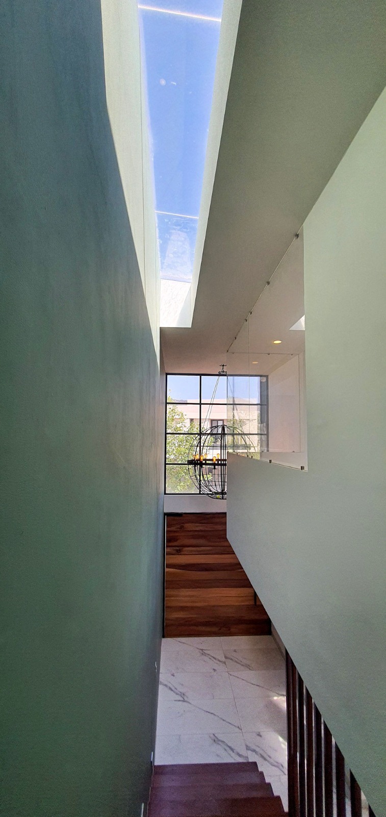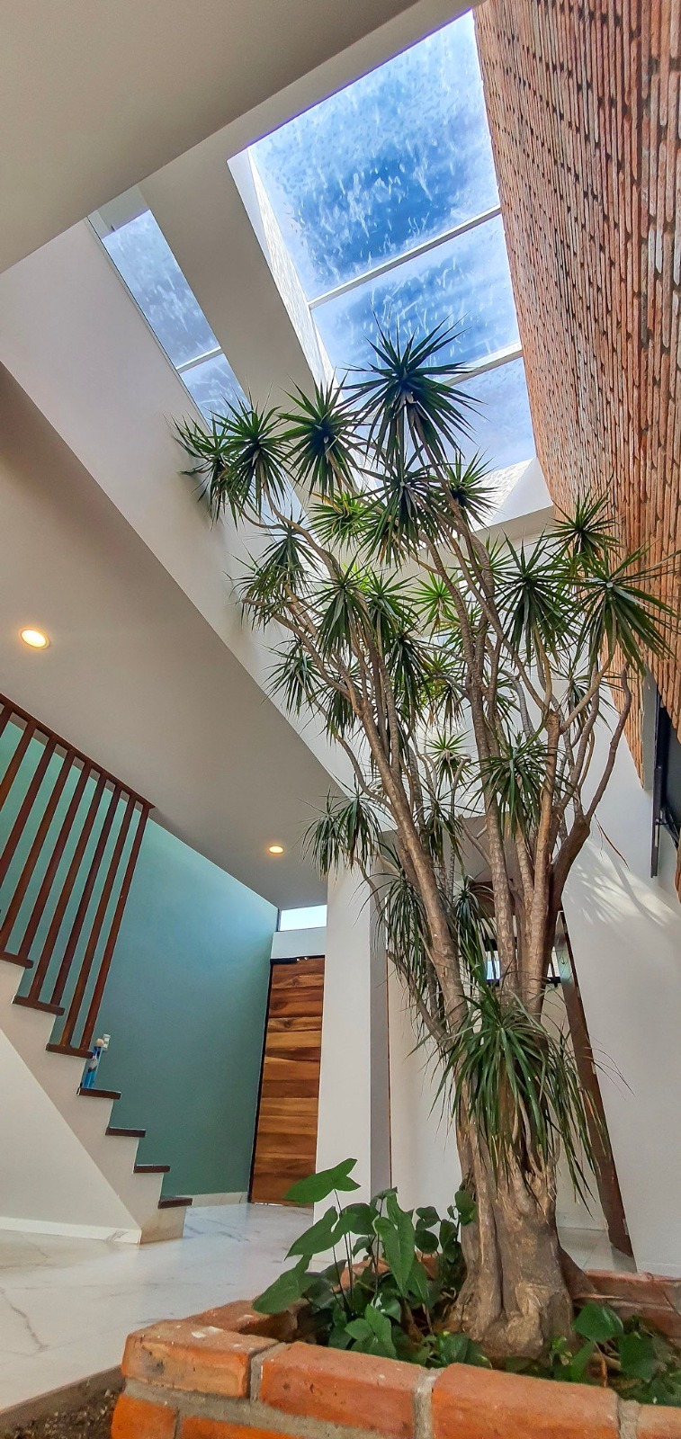 Árbol central interior con jardinera y duomo eléctrico que aporta diseño y frescura a toda la casa