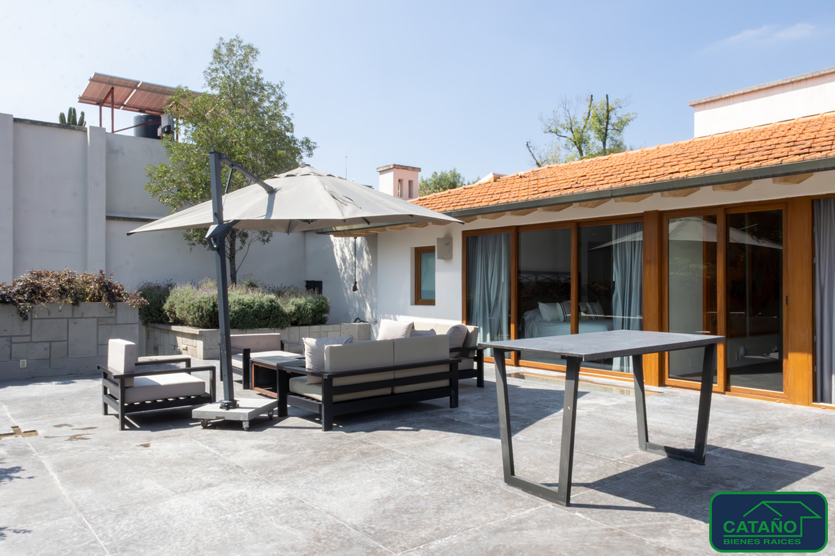 Residencia en pleno corazón de San Ángel, recién remodelada por el Arq Farre. En calle cerrada con vigilancia, consta de amplios espacios. Sala, comedor, cocina integral, estudio, medio baño, sala de tv. Terraza techada, jardín como de 500 m2 aprox. En el primer nivel tiene 5 recamaras, cuatro con baño y vestidor una con closet y baño. Salón de usos múltiples con medio baño, elevador. Área de lavado y cuarto de servicio, bodega, estacionamiento para 11 autos. Vigilancia.