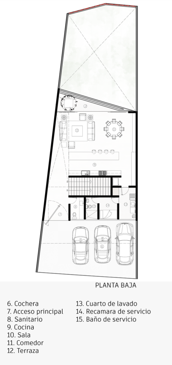PLANTA BAJA: entrada principal, cochera para 3 autos, baño de visitas, cocina equipada, sala comedor, terraza, cuarto de lavado, cuarto de servicio con baño completo