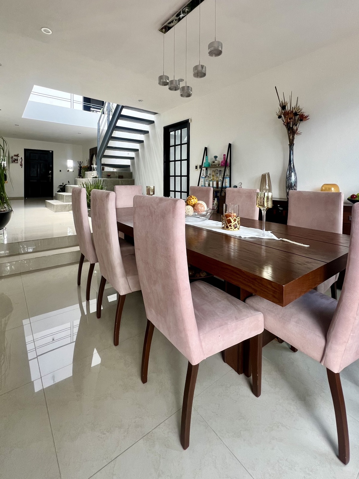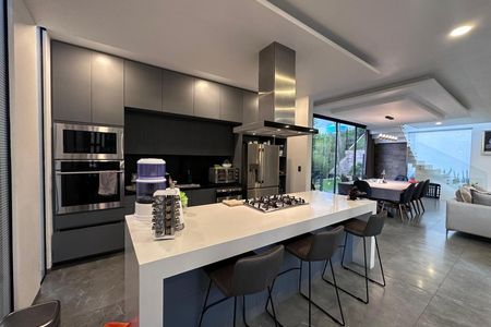 PB: Estacionamiento para 3 autos, estudio, medio baño, closet de visitas, escalera con domo, amplia sala con chimenea, comedor con acceso y vista al jardín de aproximadamente 150m2. Cocina equipada con barra desayunador, isla y área de antecomedor, alacena, patio de servicio, cuarto de lavado y cuarto de servicio, bodega.