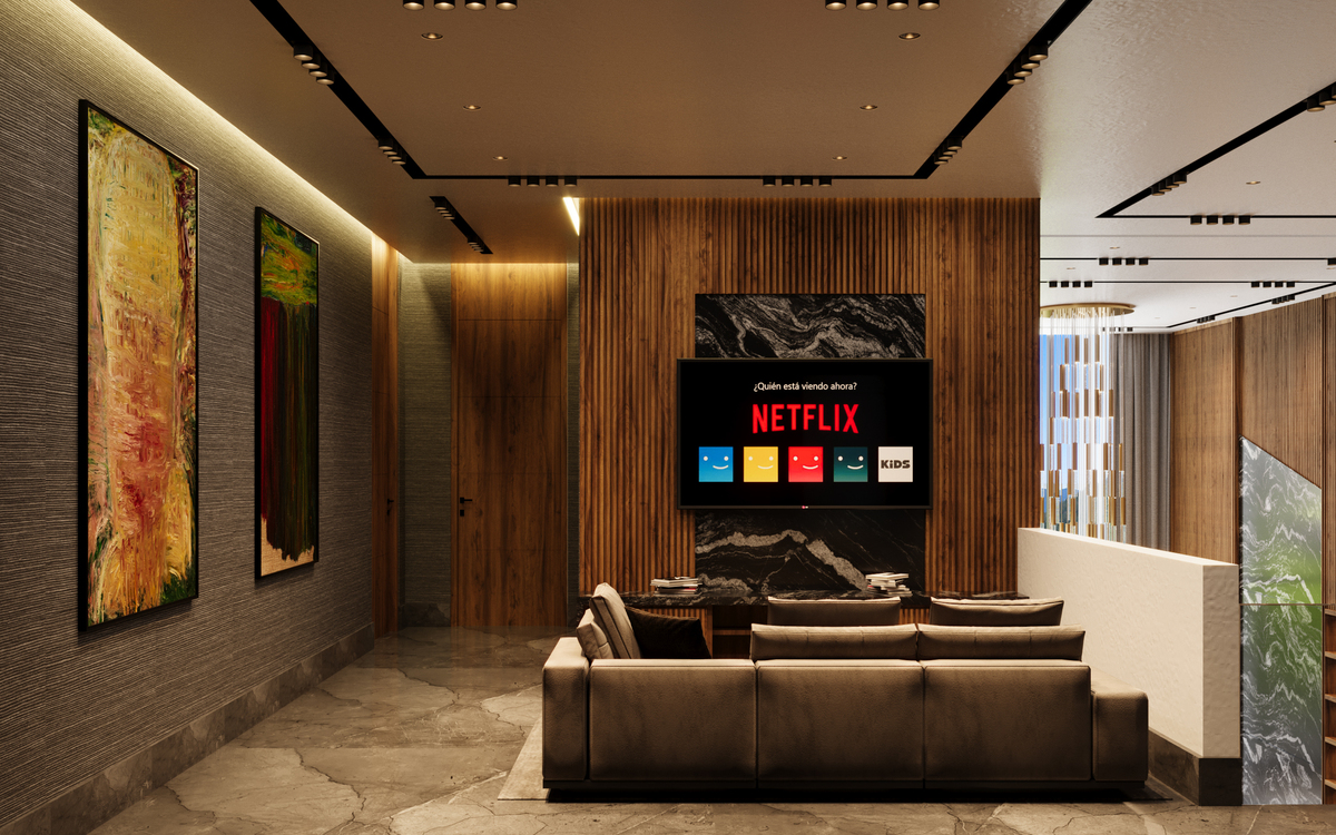 cubo de elevador y escalera a planta alta, Sala en doble altura,
