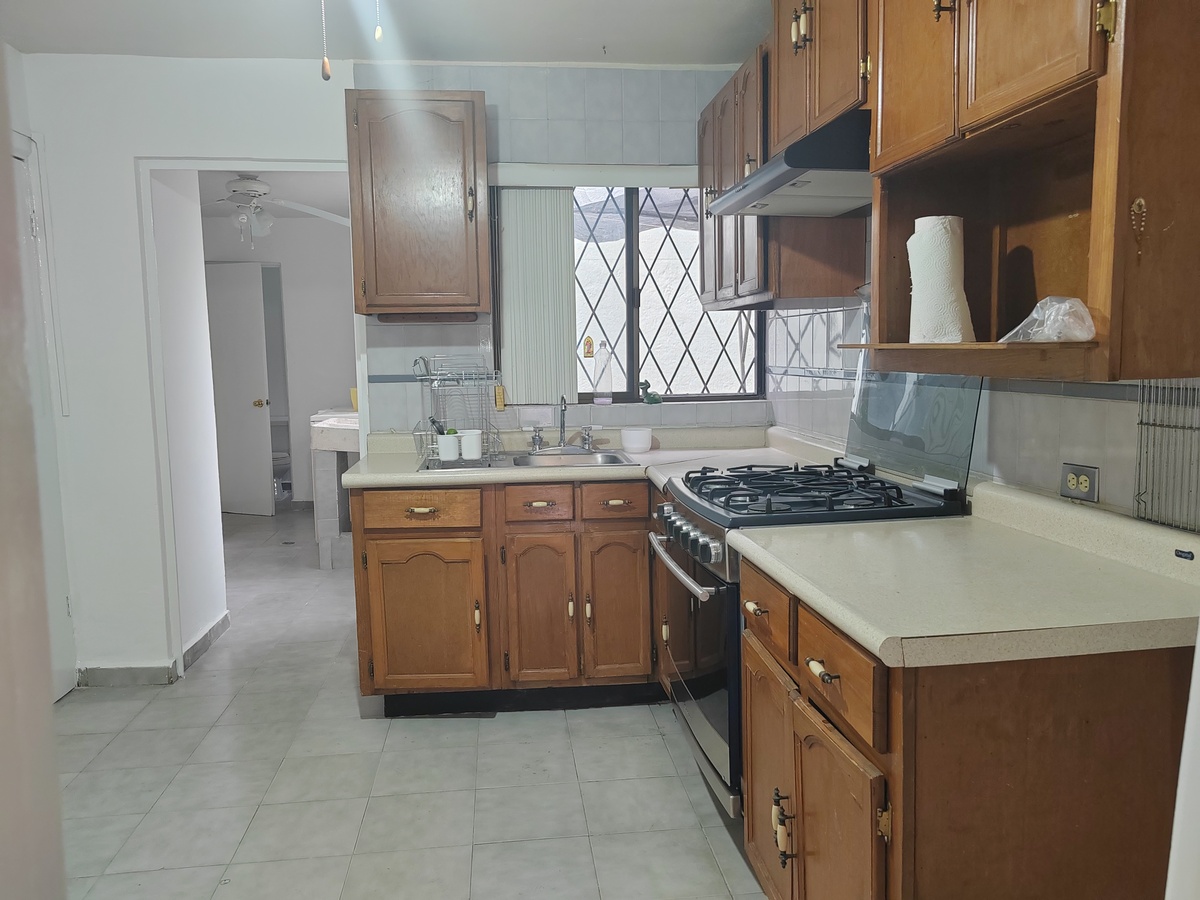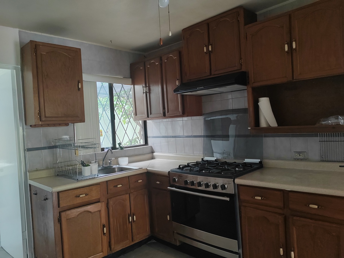 Cocina integral con estufa y alacenas de pared y abanico de techo.