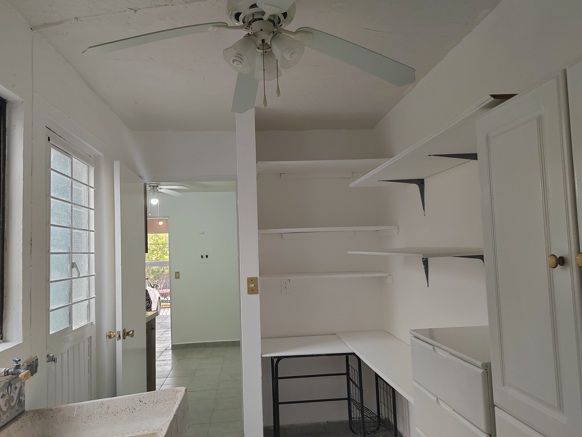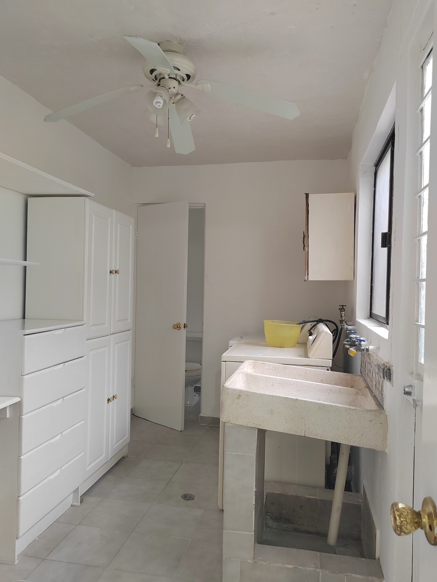 Lavandería con abanico de techo, tallador y muebles para guardar los artículos de limpieza y