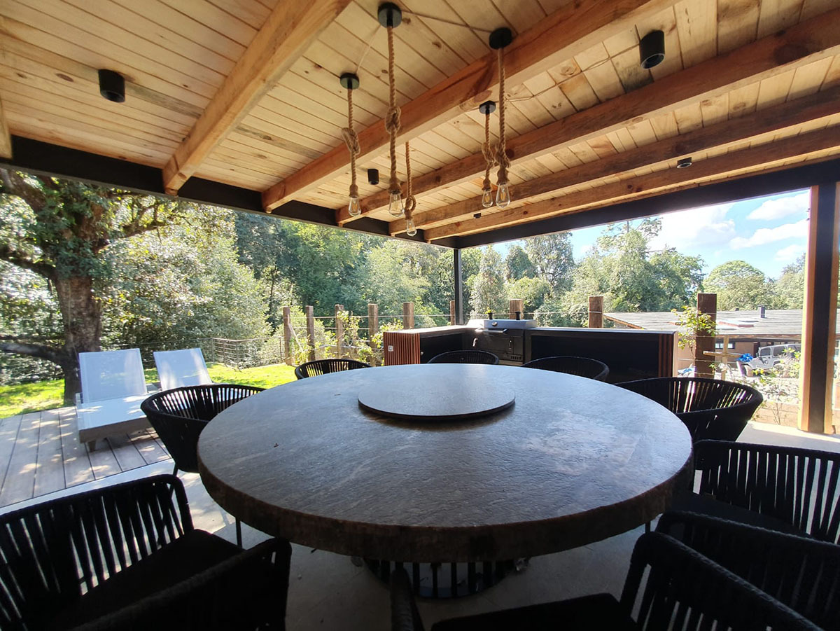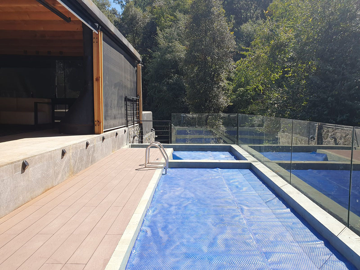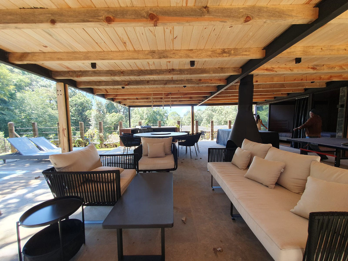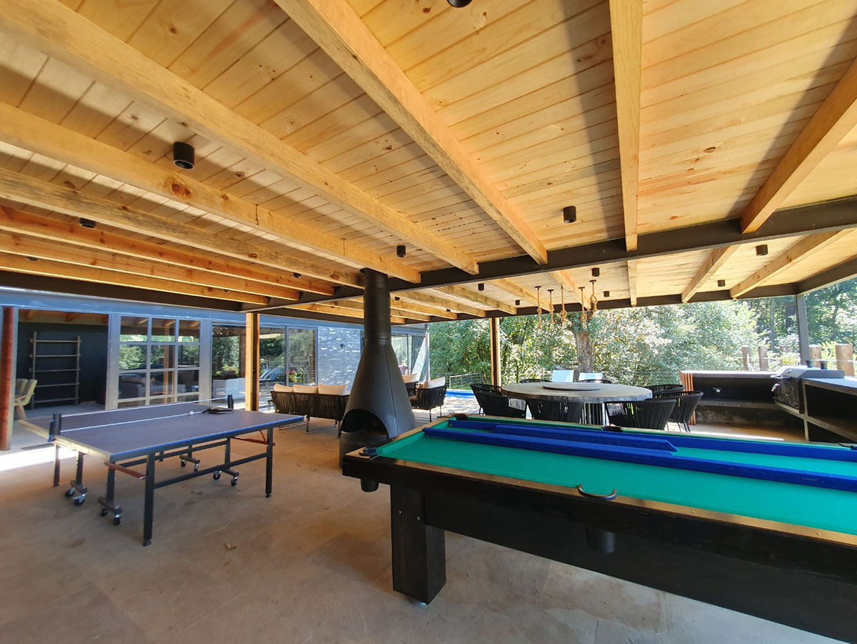 La terraza está equipada con asador y el espacio es perfecto para los amantes de la cocina. Desde aquí, puedes acceder a un comedor con capacidad para varias personas y al jacuzzi con un asoleadero y vista al jardín.