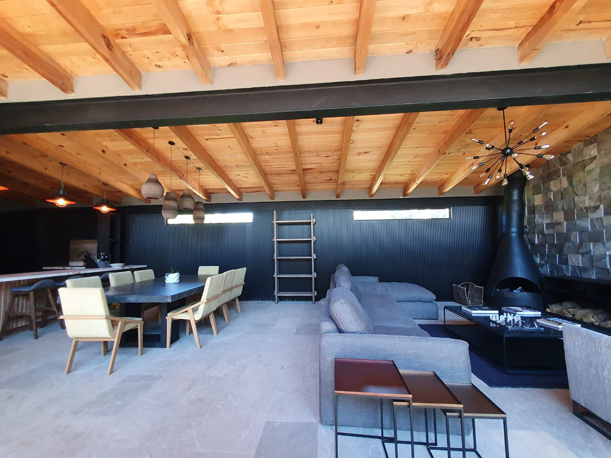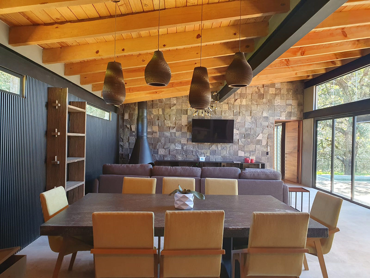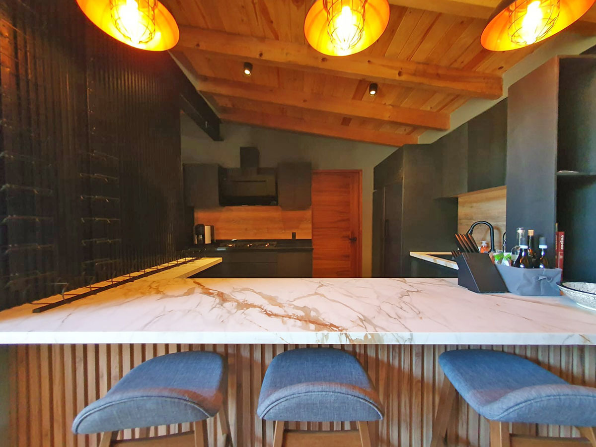 Al ingresar, te recibirá un elegante vestíbulo que conduce a una amplia sala de estar con techos altos y grandes ventanales que permiten la entrada de luz natural y ofrecen impresionantes vistas de los alrededores. La decoración interior es una fusión de estilo contemporáneo y toques rústicos que crean un ambiente acogedor y sofisticado.