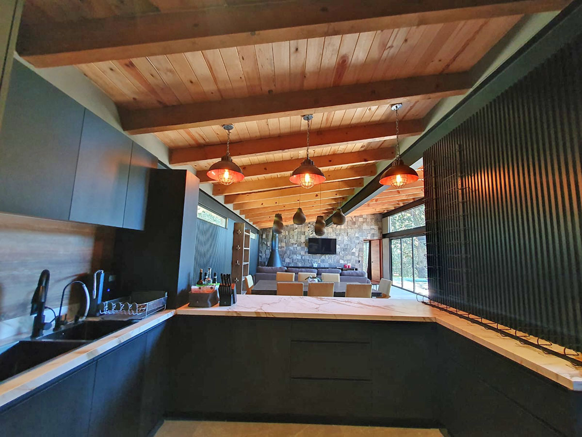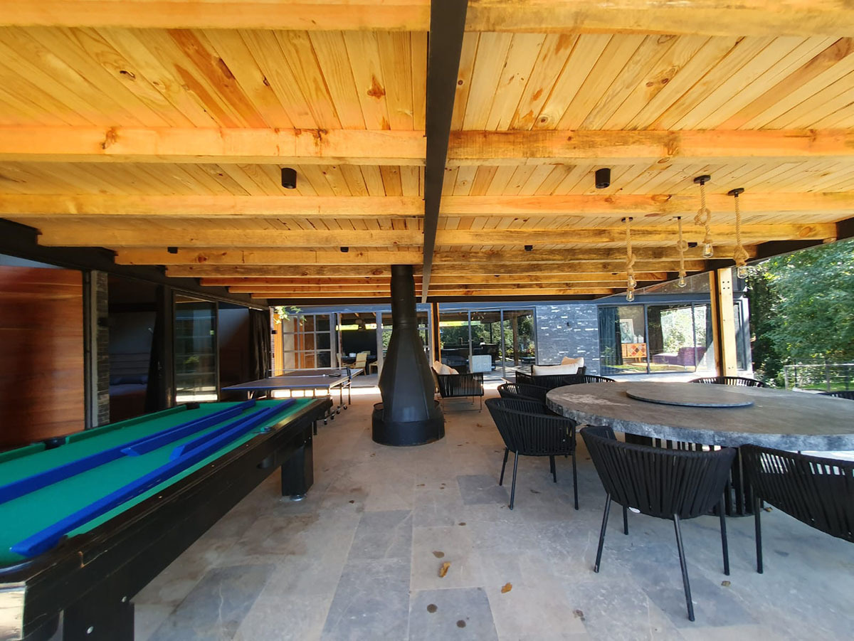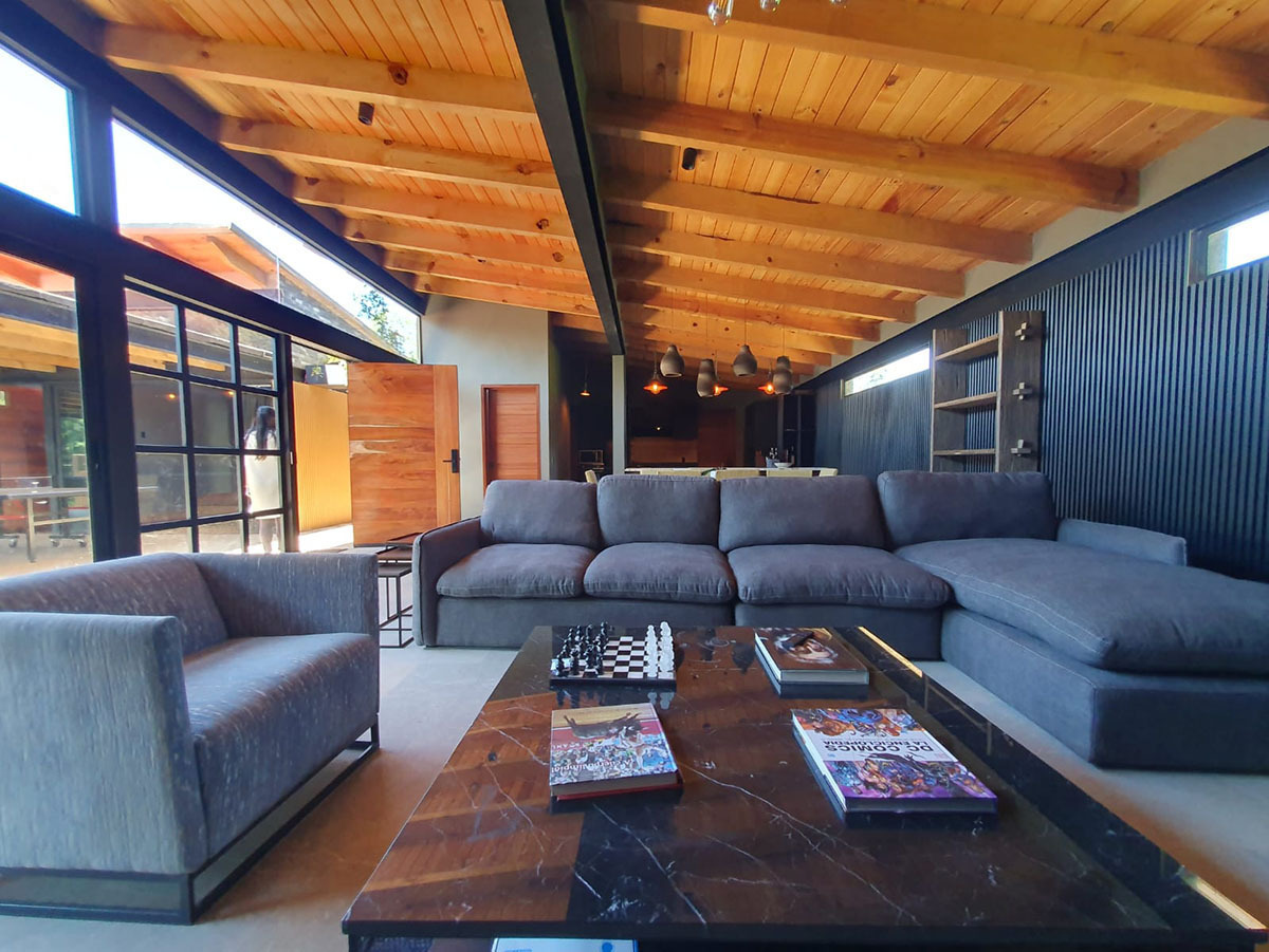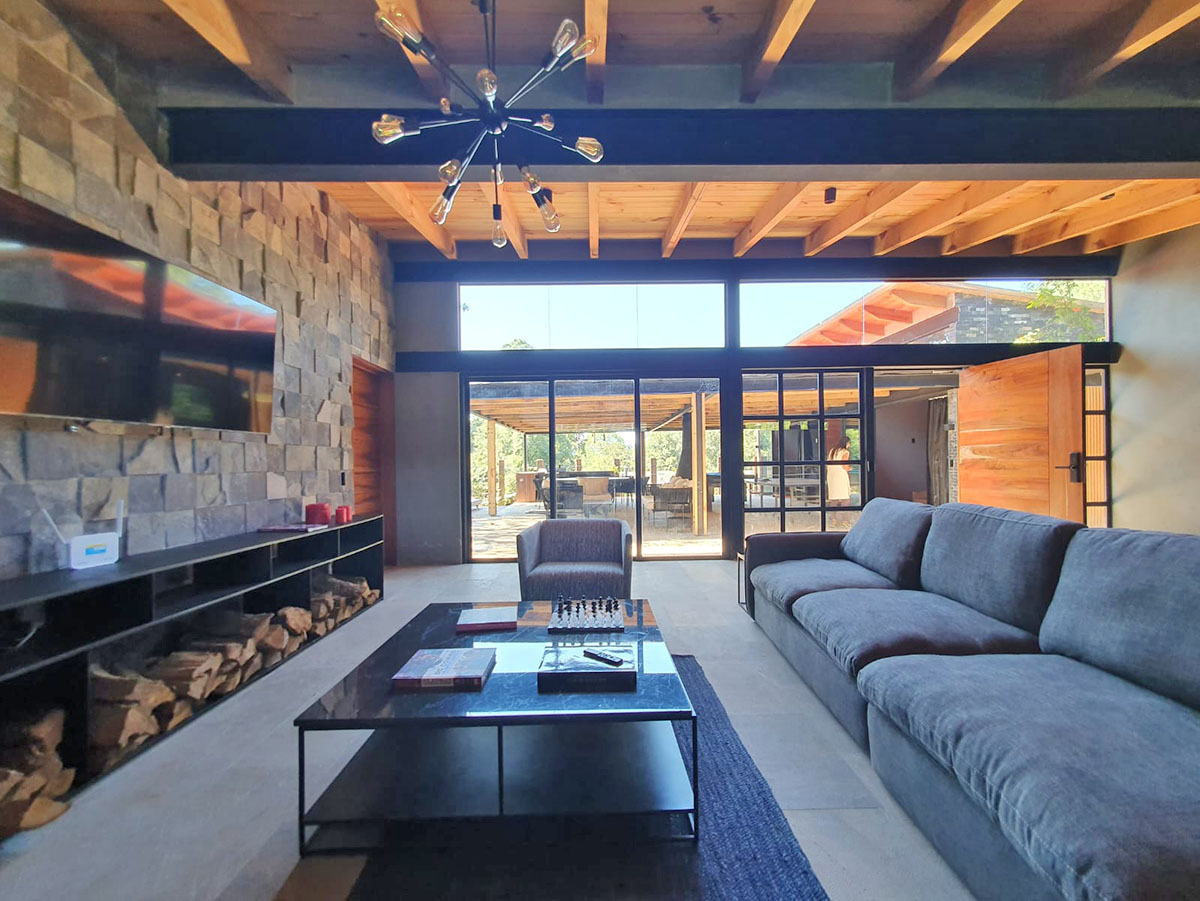 Al ingresar, te recibirá un elegante vestíbulo que conduce a una amplia sala de estar con techos altos y grandes ventanales que permiten la entrada de luz natural y ofrecen impresionantes vistas de los alrededores. La decoración interior es una fusión de estilo contemporáneo y toques rústicos que crean un ambiente acogedor y sofisticado.